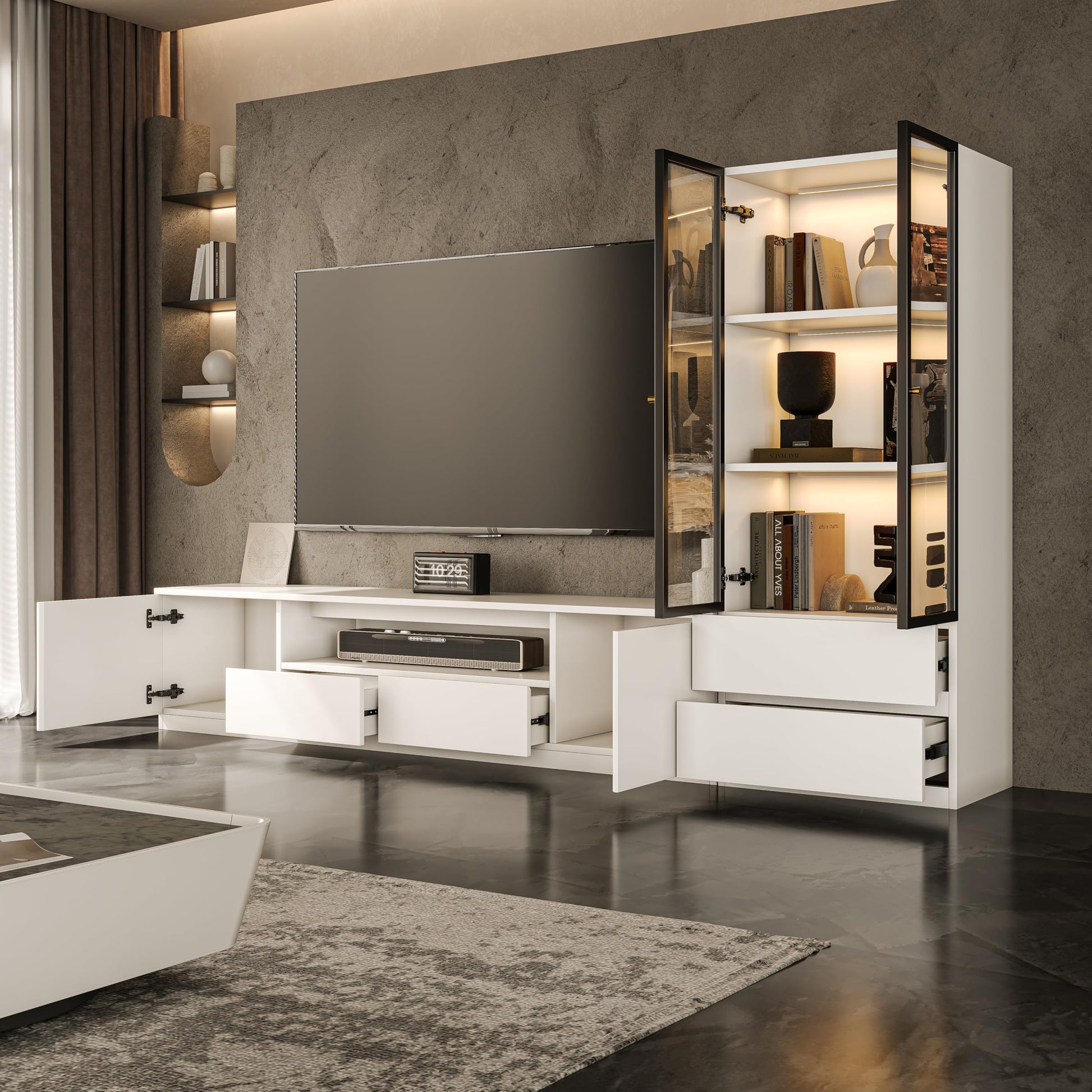 This modern white entertainment center is a complete 2-piece media console solution designed for large living spaces. The set includes a TV stand and glass display cabinet, offering unified style and extensive storage for your entertainment area.