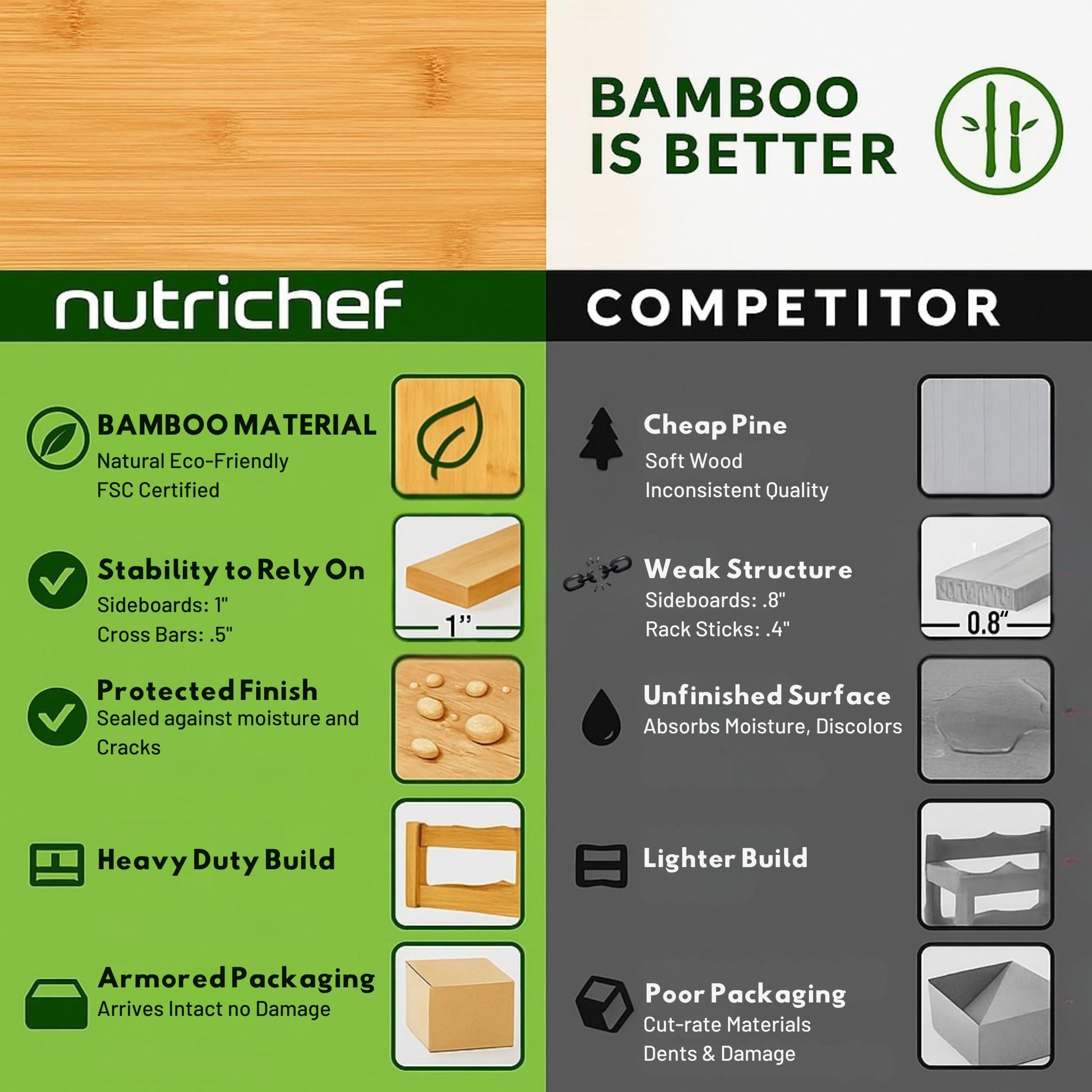 - Upgraded sturdy bamboo construction with thick 1" sideboards and 0.5" reinforced sticks