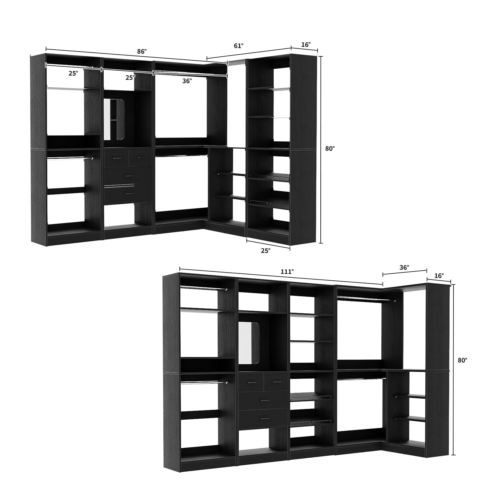 Transform your space with this comprehensive corner closet system featuring integrated mirror design and versatile storage solutions. This all-in-one wardrobe organizer includes three 25-inch closet towers and one 36-inch corner tower that can function independently or combine to create a luxury storage wall.