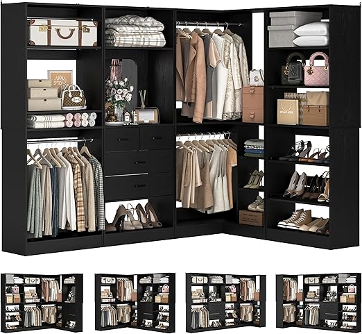 - Configurable Layout: Four separate towers can be arranged as freestanding units or combined into a complete closet system