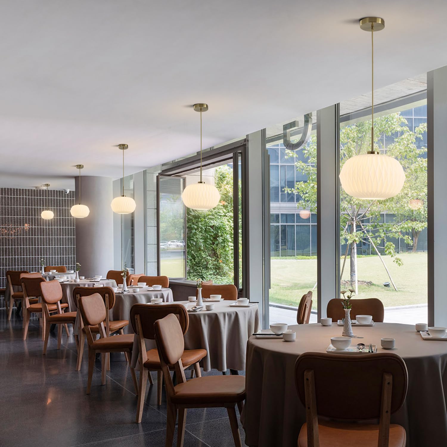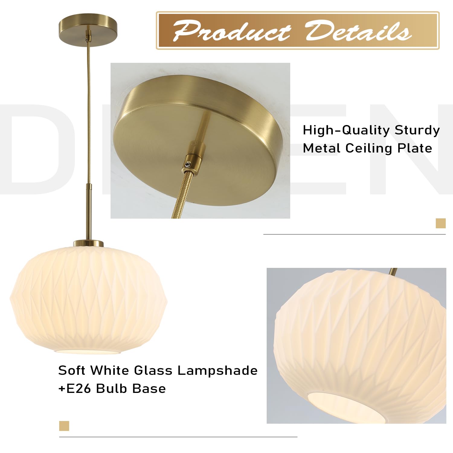 Elevate your interior with this stunning mid-century modern pendant light featuring a luxurious gold finish and elegant ribbed milk glass globe. Perfect for creating ambient lighting in dining rooms, kitchens, bedrooms, and hallways.