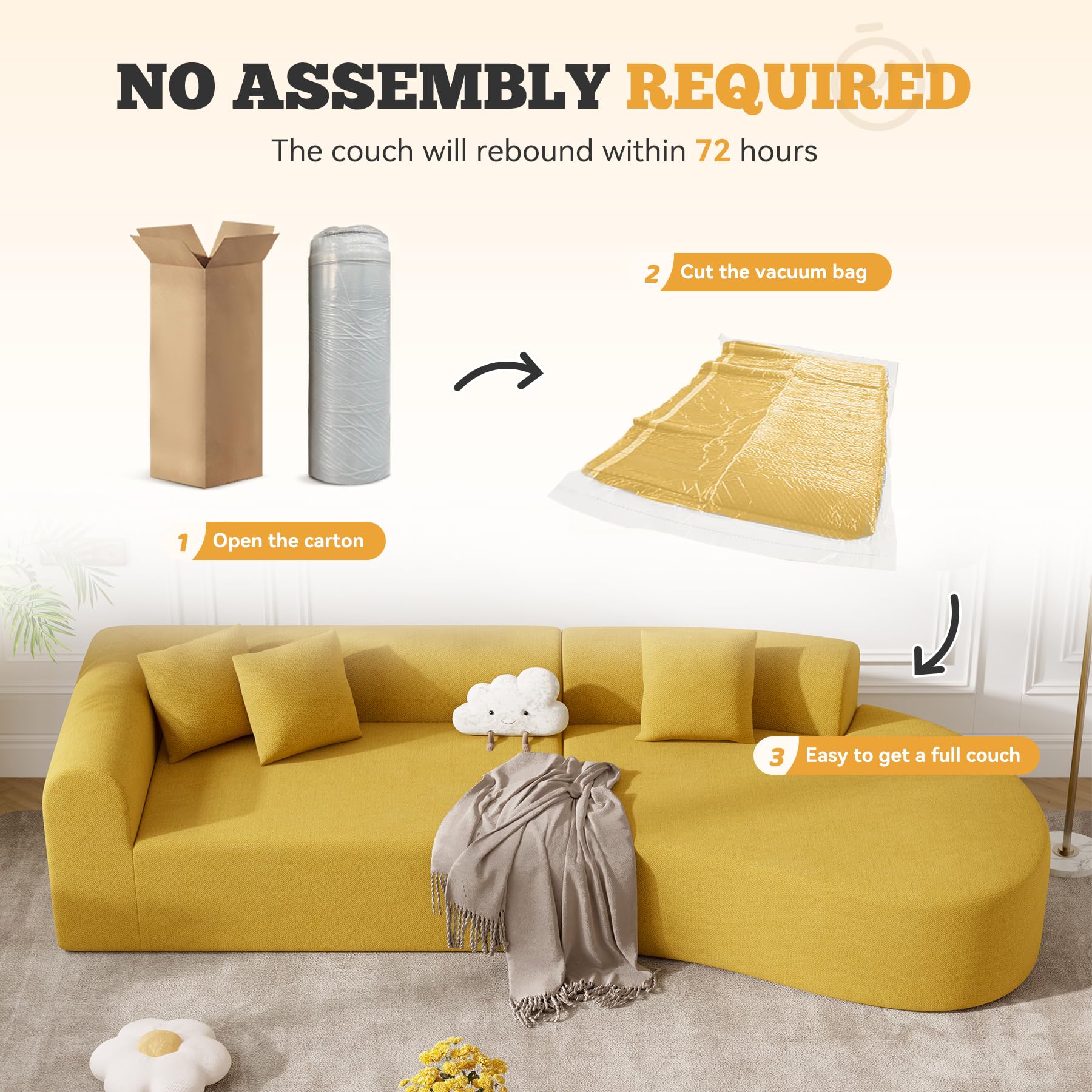 - 【No Assembly Required】 Say goodbye to furniture assembly nightmares with our modular cloud couch! Simply unpack, lightly pat the pieces, and allow the couch to regain its full shape within 72 hours. Perfect for large spaces, apartments, houses and anyone who needs a quick and easy furniture solution. Enjoy a hassle-free setup and the immediate comfort of your new sofa!