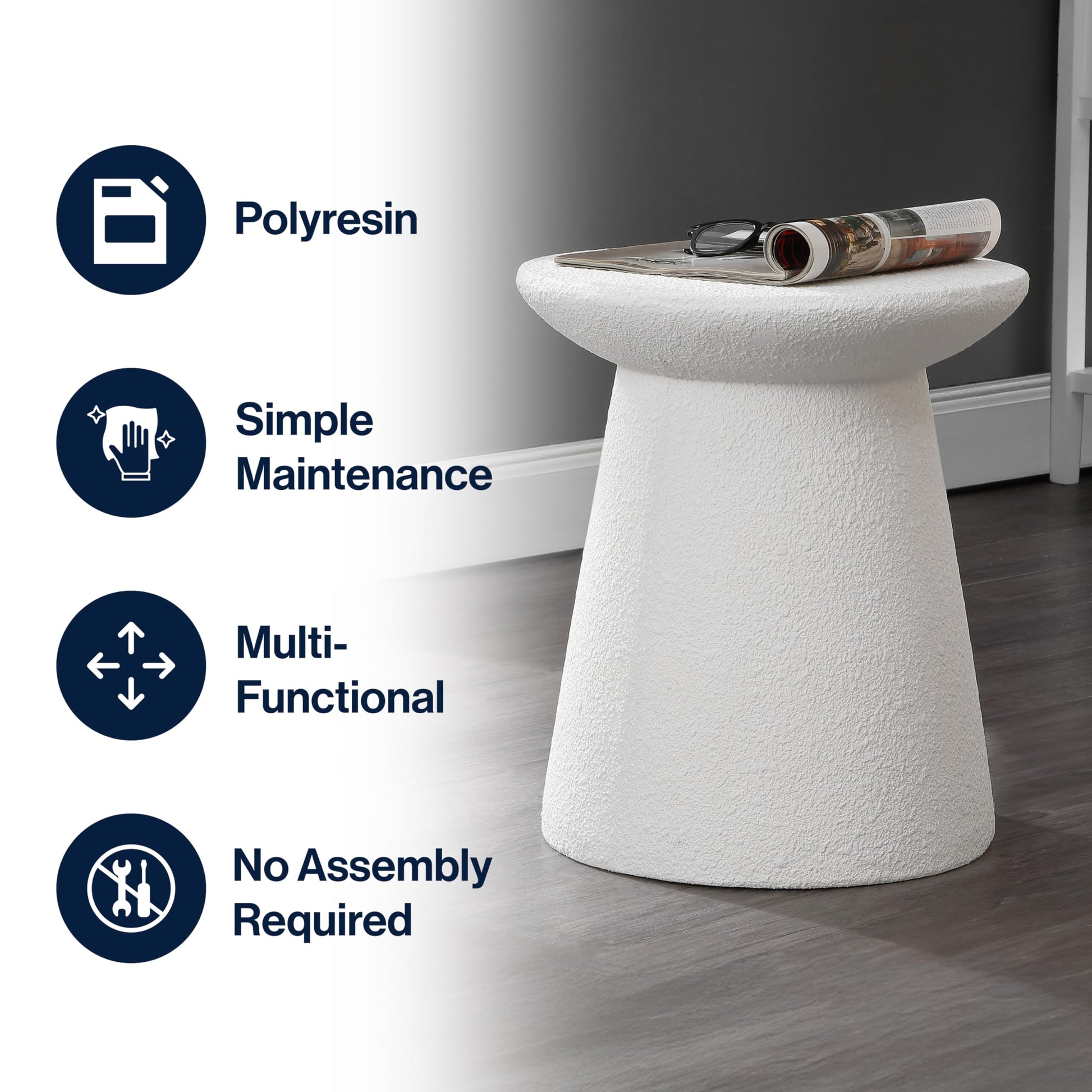 This contemporary drum-style accent table brings clean, minimalist design to any indoor or outdoor space. The frosted white finish creates a sophisticated look that complements mid-century, art deco, and bohemian interiors. Perfect as a pedestal, side table, or statement piece in your patio, garden room, bathroom, or living room.