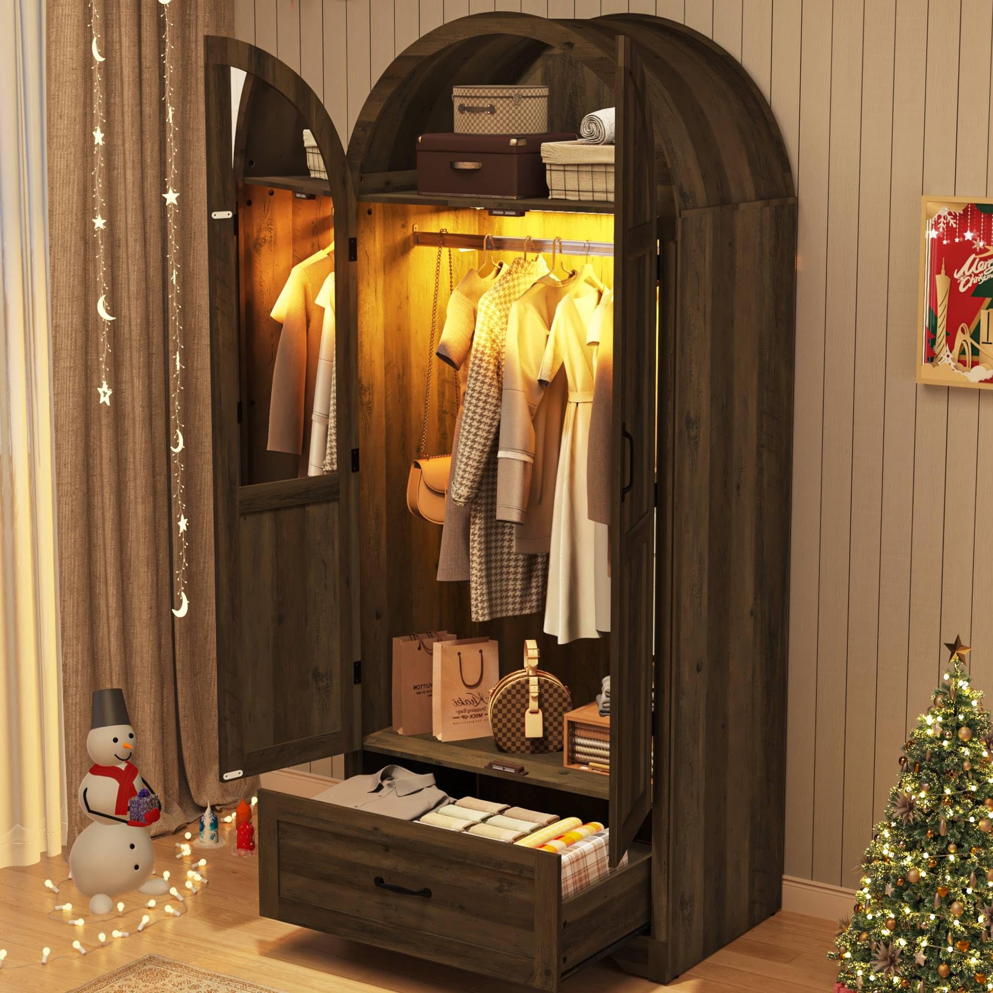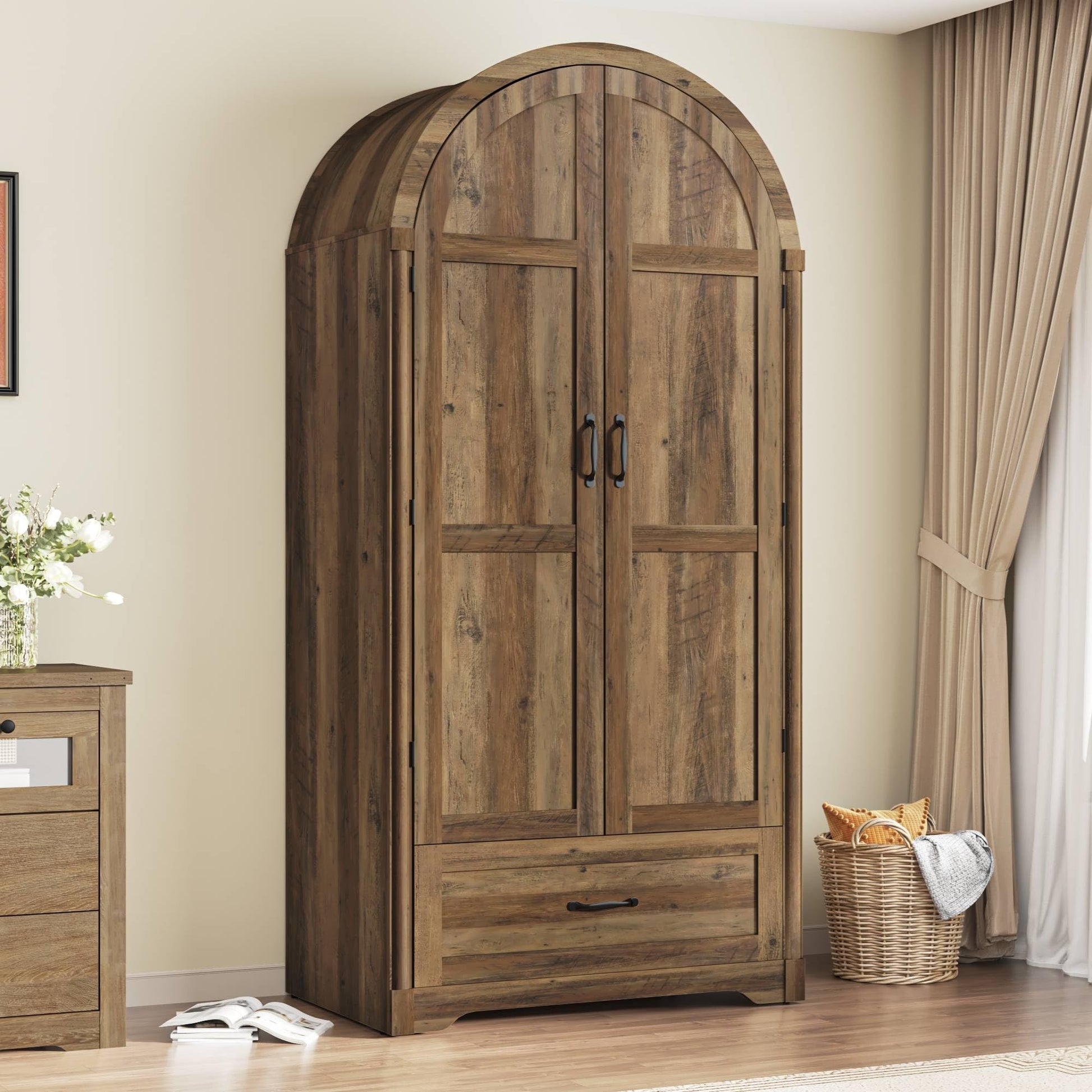 Designed with a graceful arched top and realistic wood texture, this wardrobe delivers a soft yet eye-catching statement in any space. The rich wood textured finish paired with sleek gold handles enhances its refined, modern character.