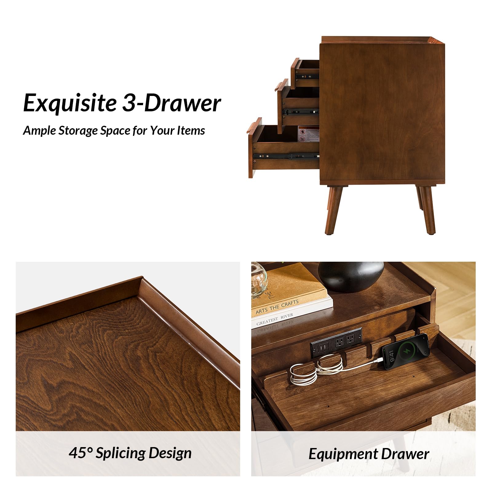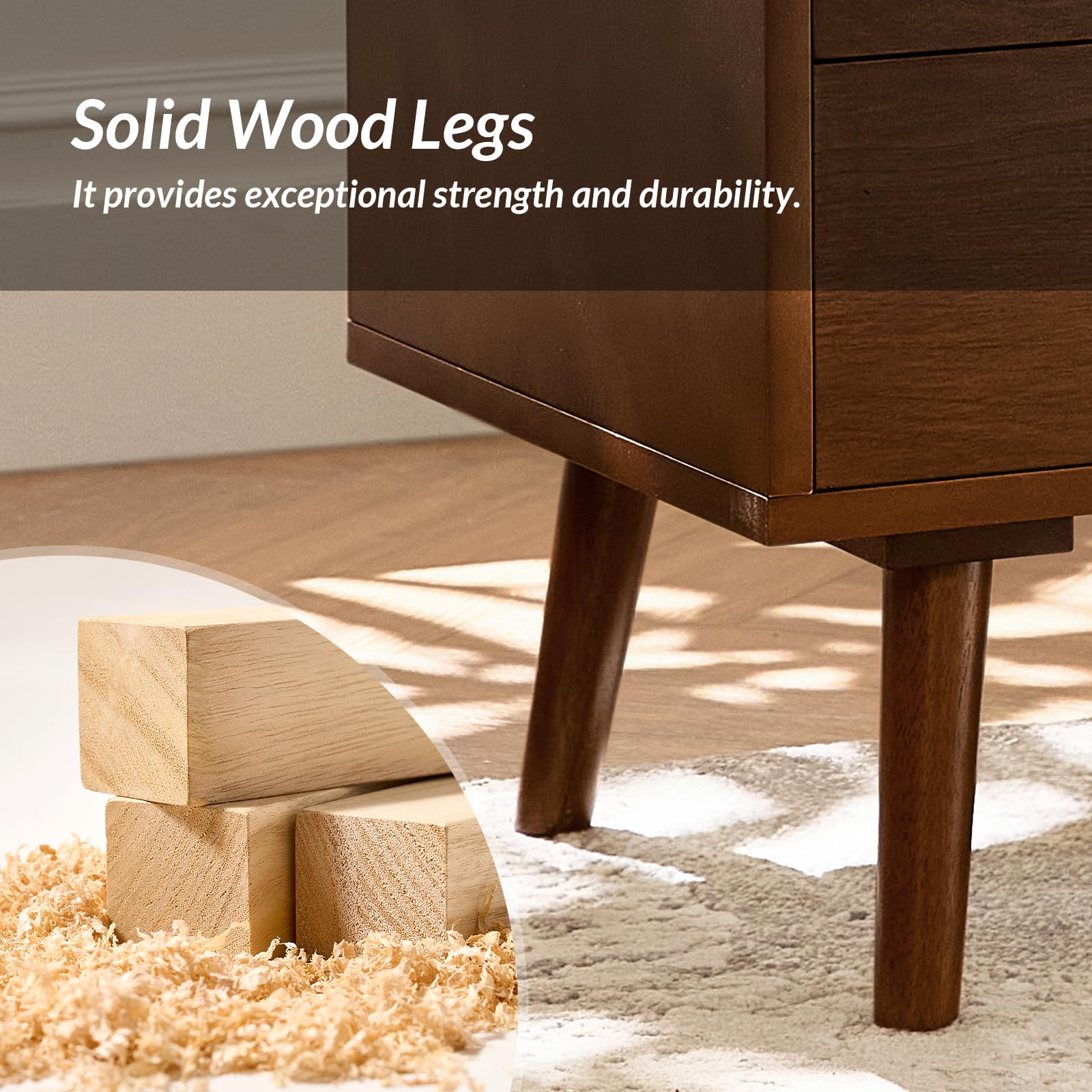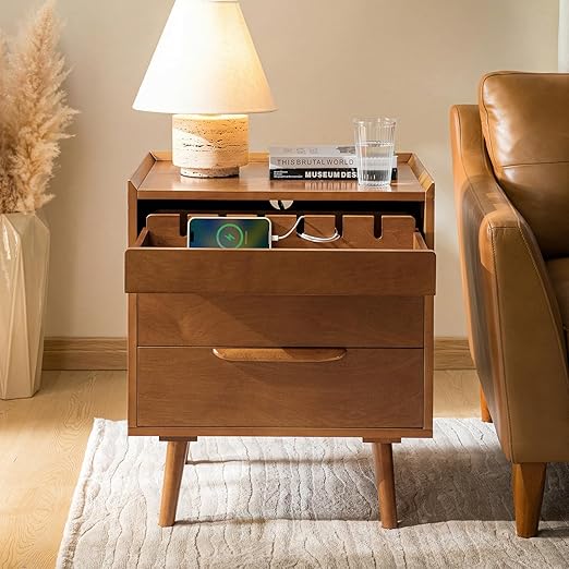 This mid-century modern end table combines functional storage with convenient charging capabilities, making it perfect for bedrooms, living rooms, or offices. The set of 2 features a walnut stained finish with solid wood legs and a durable MDF construction.