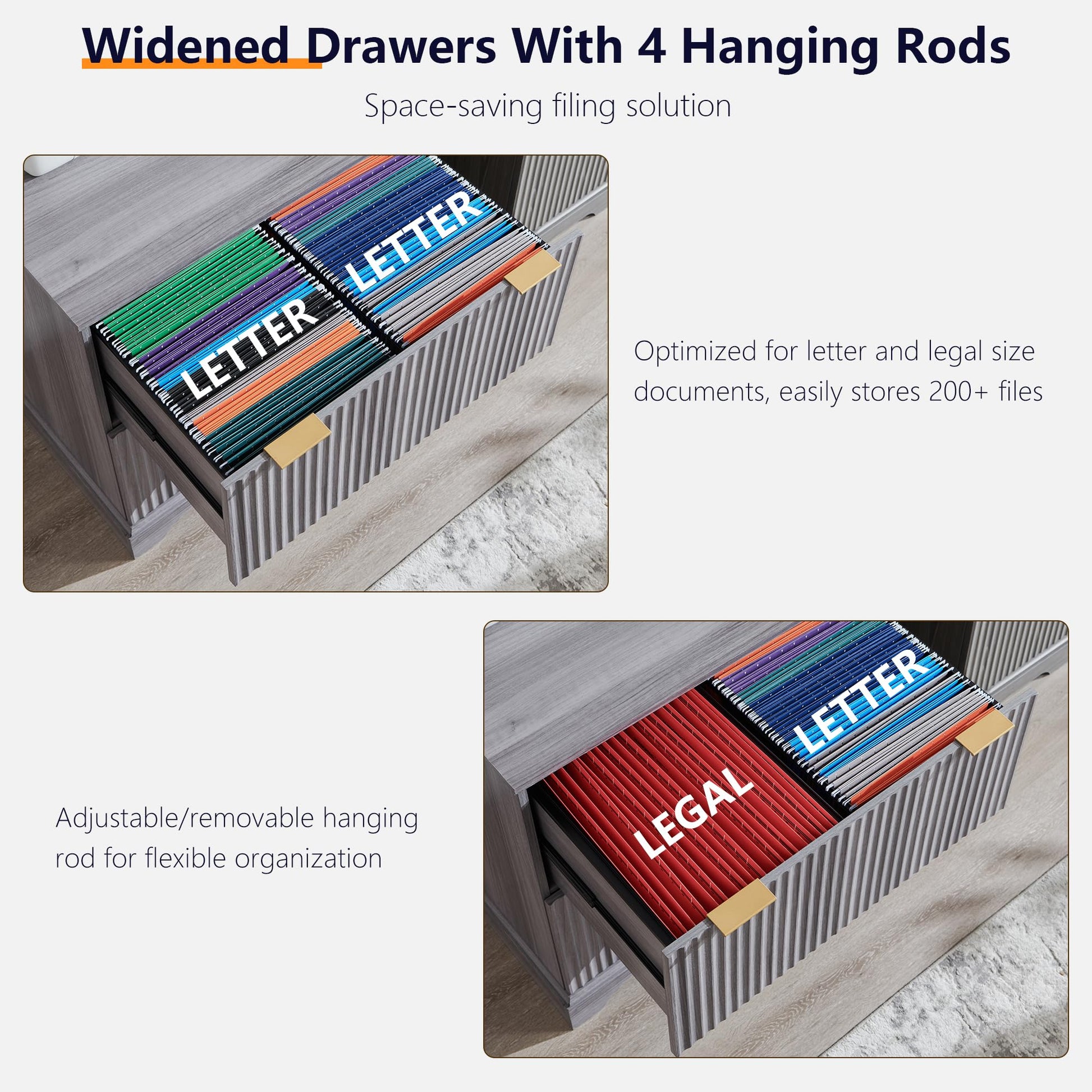 This extra-large 2 drawer file cabinet features widened drawers with dual hanging rods to hold two rows of Letter/A4/Legal files simultaneously, accommodating over 200 files total. The premium filing cabinet includes ultra-smooth silent gliding rails for noise-free access and a full-extension design for easy retrieval of all documents.