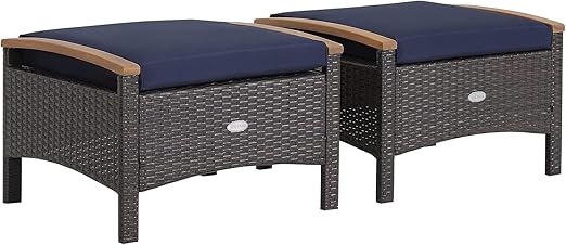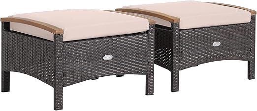 2 Piece Patio Rattan Ottomans with Acacia Wood Handles