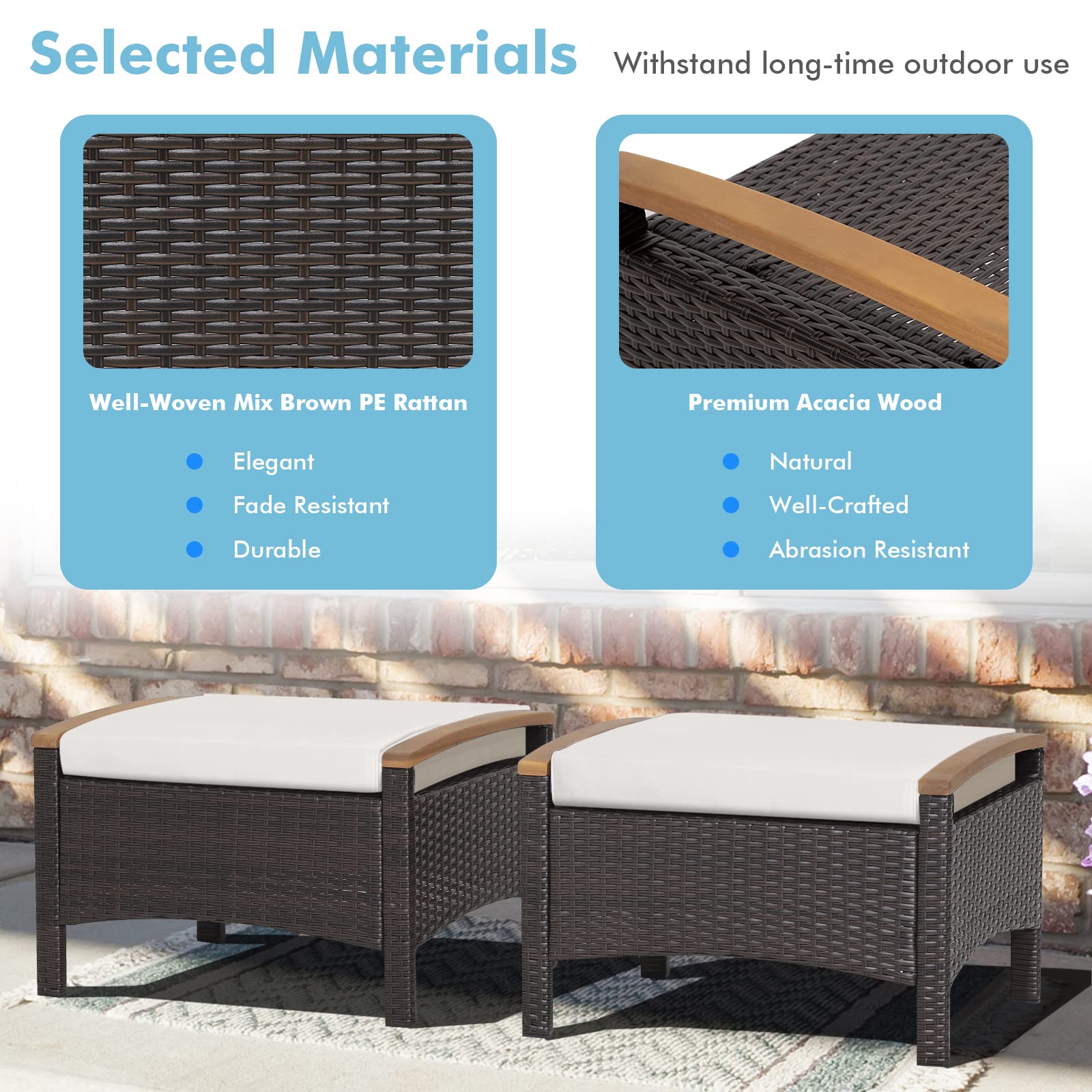 Transform your outdoor space with these versatile 3-in-1 patio ottomans that function as footstools, extra seating, or side tables. Crafted with durable PE rattan wicker and featuring natural acacia wood handles, these ottomans combine style and functionality for your backyard, balcony, or poolside area.