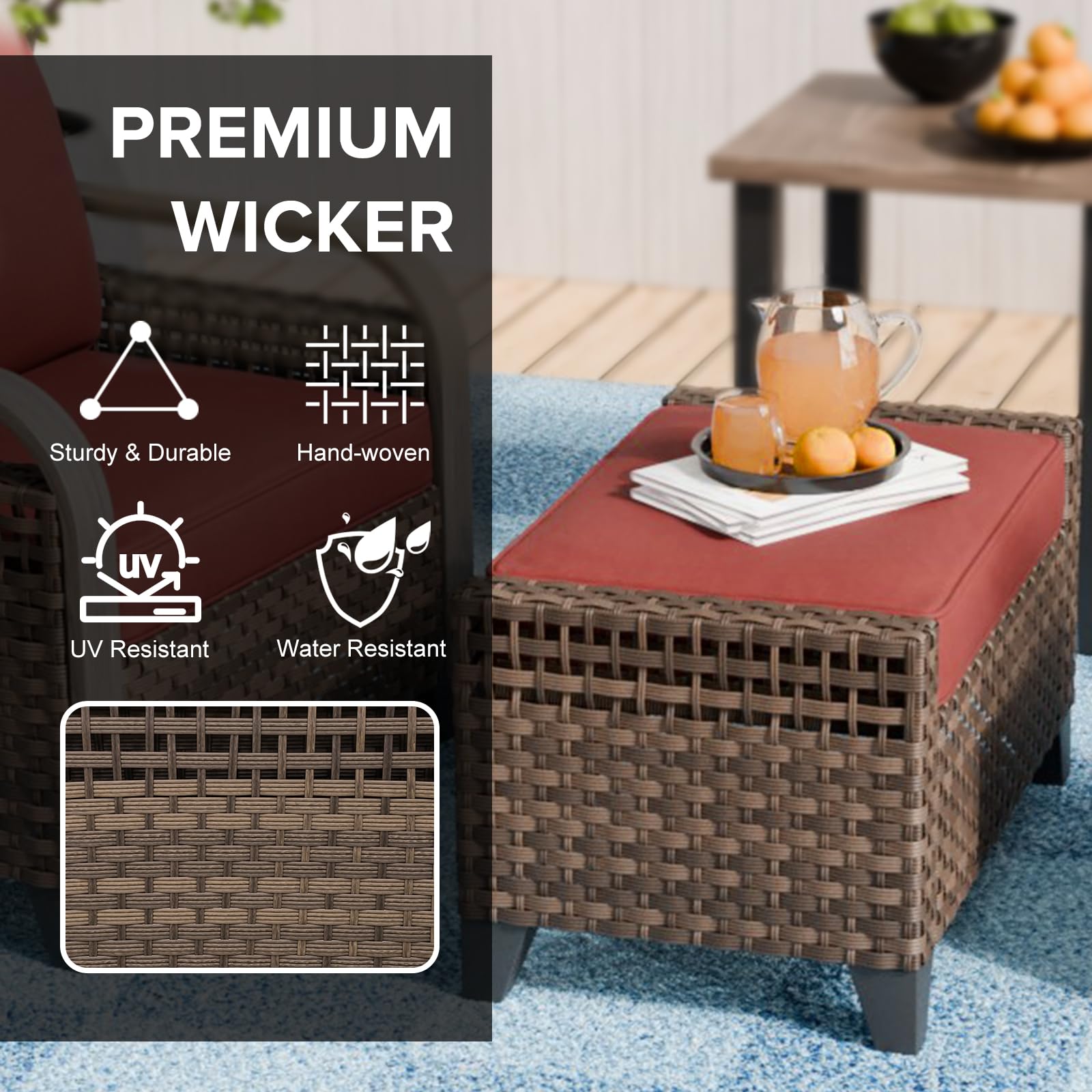 Crafted with durable wicker construction and featuring plush removable cushions, this ottoman set combines style and functionality. The brown wicker frame paired with red cushions creates a striking visual contrast that complements any outdoor décor.