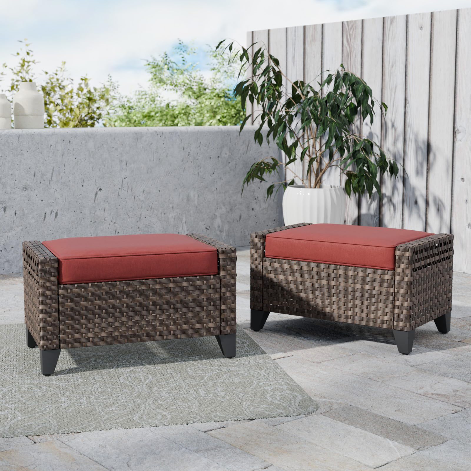 Elevate your outdoor living space with this modern 2-piece wicker ottoman set. Designed for versatility and comfort, these ottomans serve as the perfect foot rest for your patio couch or as additional seating for guests.