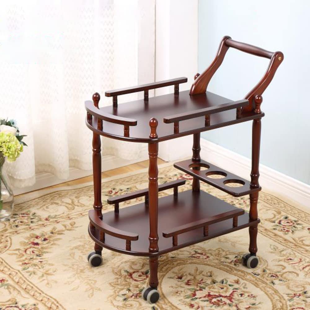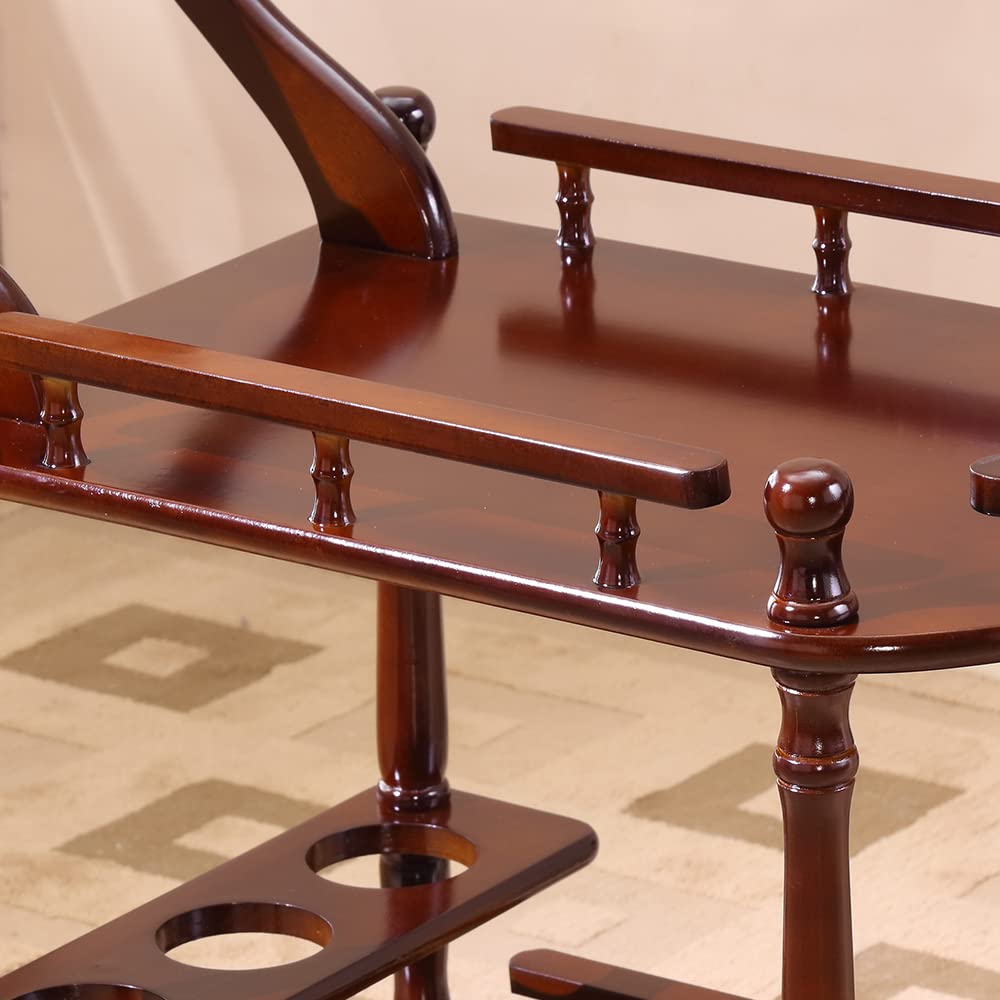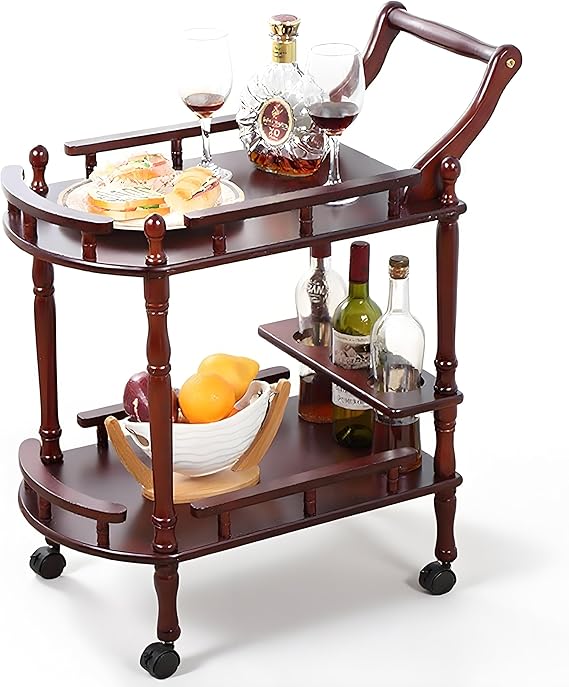 This midcentury modern bar cart combines functionality with elegant design, perfect for entertaining and everyday use. Crafted from imported rubberwood with a rich brown finish, this mobile serving cart features two spacious tiers for organizing tableware, beverages, and food items.