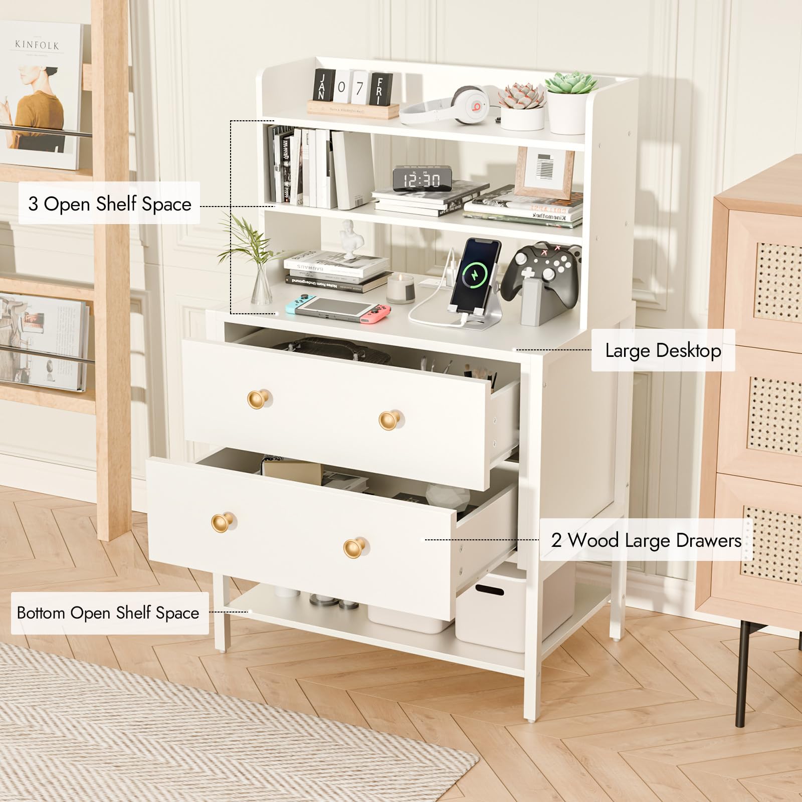 This large wooden nightstand combines functionality with modern design, featuring 2 adjustable drawers and 4-tier shelves for versatile storage. The integrated charging station keeps your devices powered and within reach, making it perfect for bedrooms, living rooms, or offices.