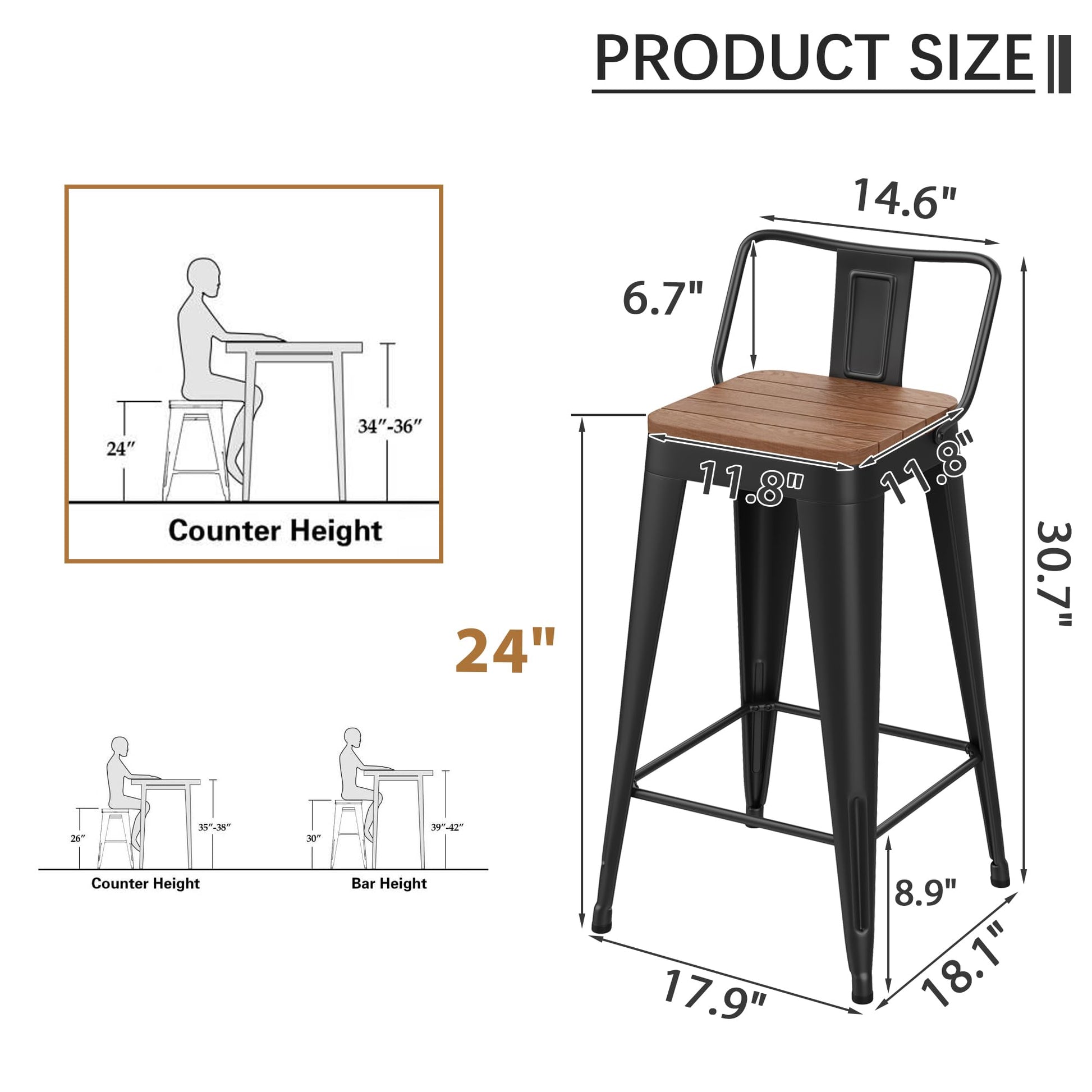 24" Metal Bar Stools Set of 4 with Wood Plastic Seat