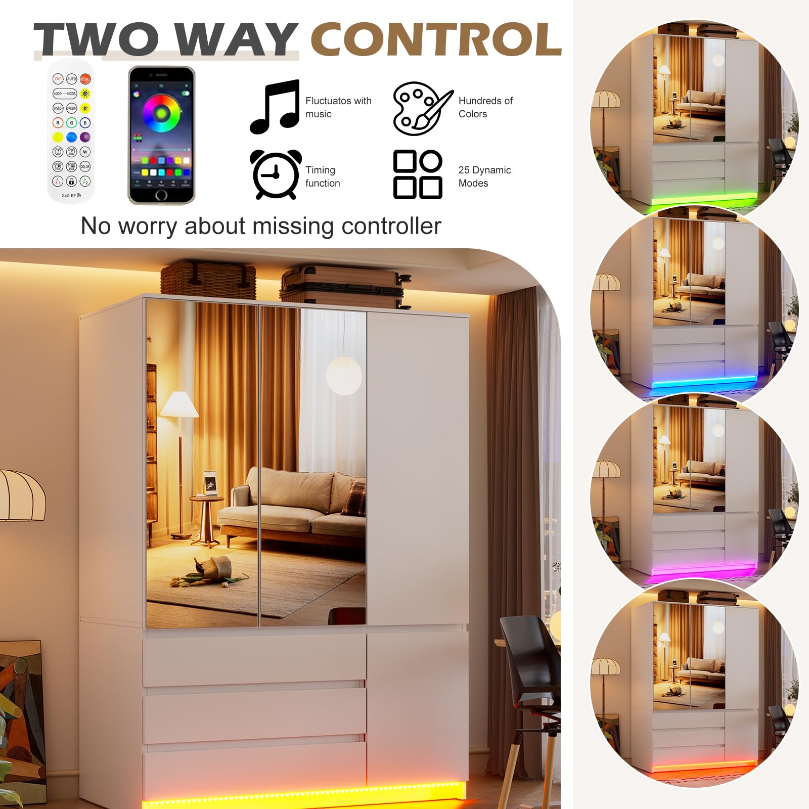 - Three spacious doors with integrated full-length mirror