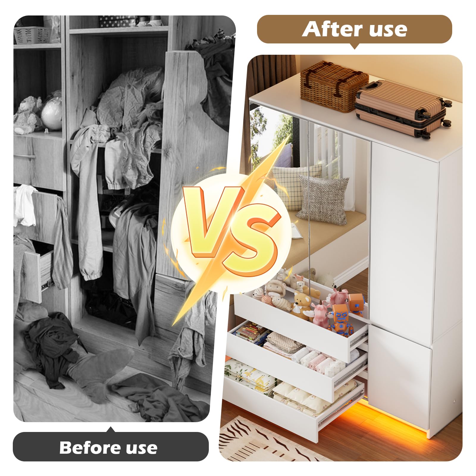 - Three large drawers for folded clothing and accessories