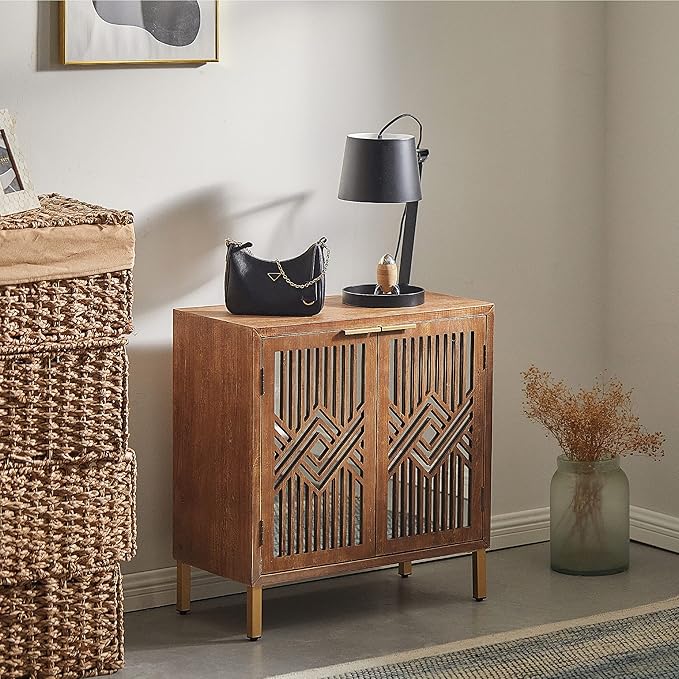 Elevate your space with this modern accent dresser featuring a striking geometric mirror front design. Perfect for living rooms, entryways, or bedrooms, this versatile storage solution combines contemporary style with practical functionality.