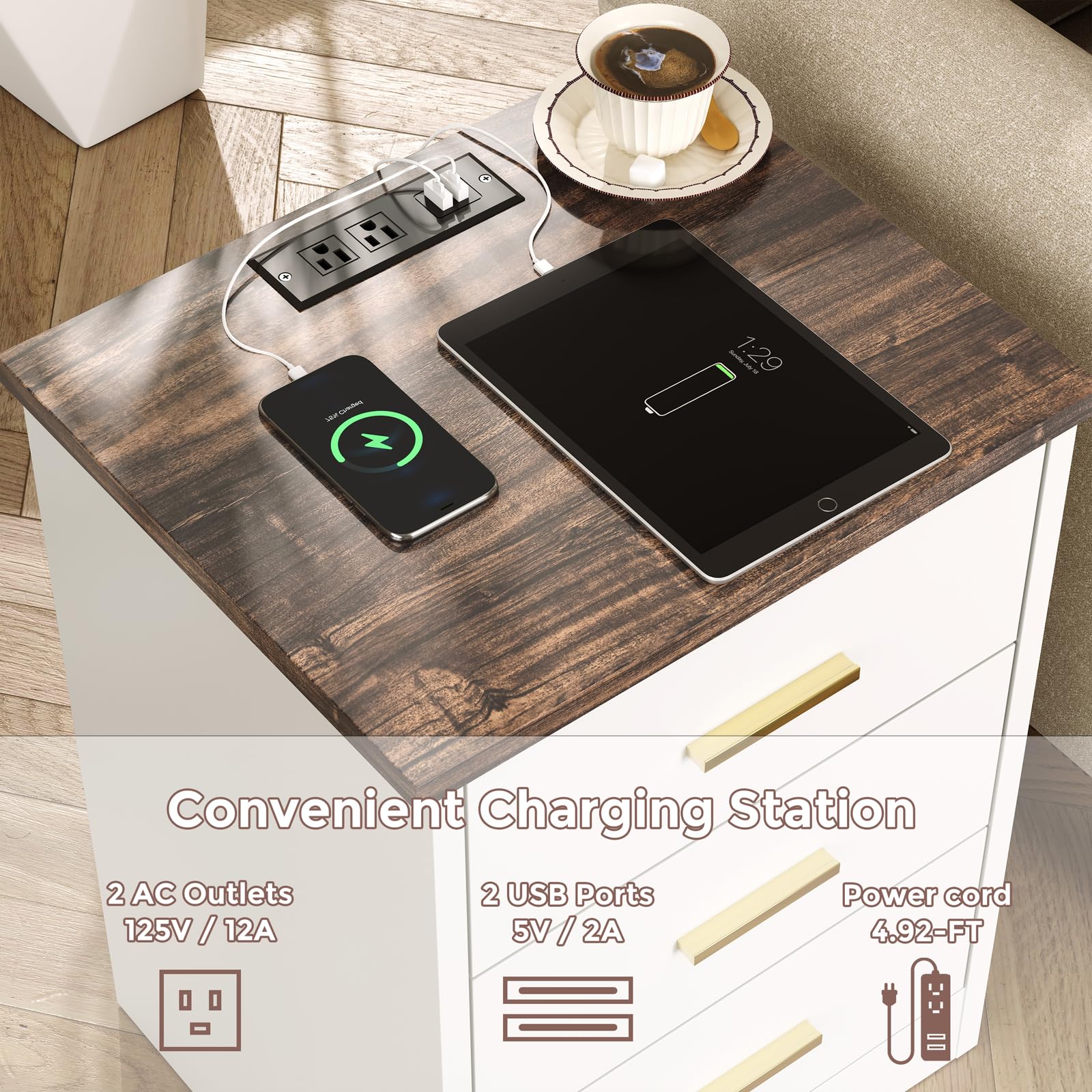 Perfect for bedrooms, living rooms, or any space where you need compact storage with the added convenience of device charging.