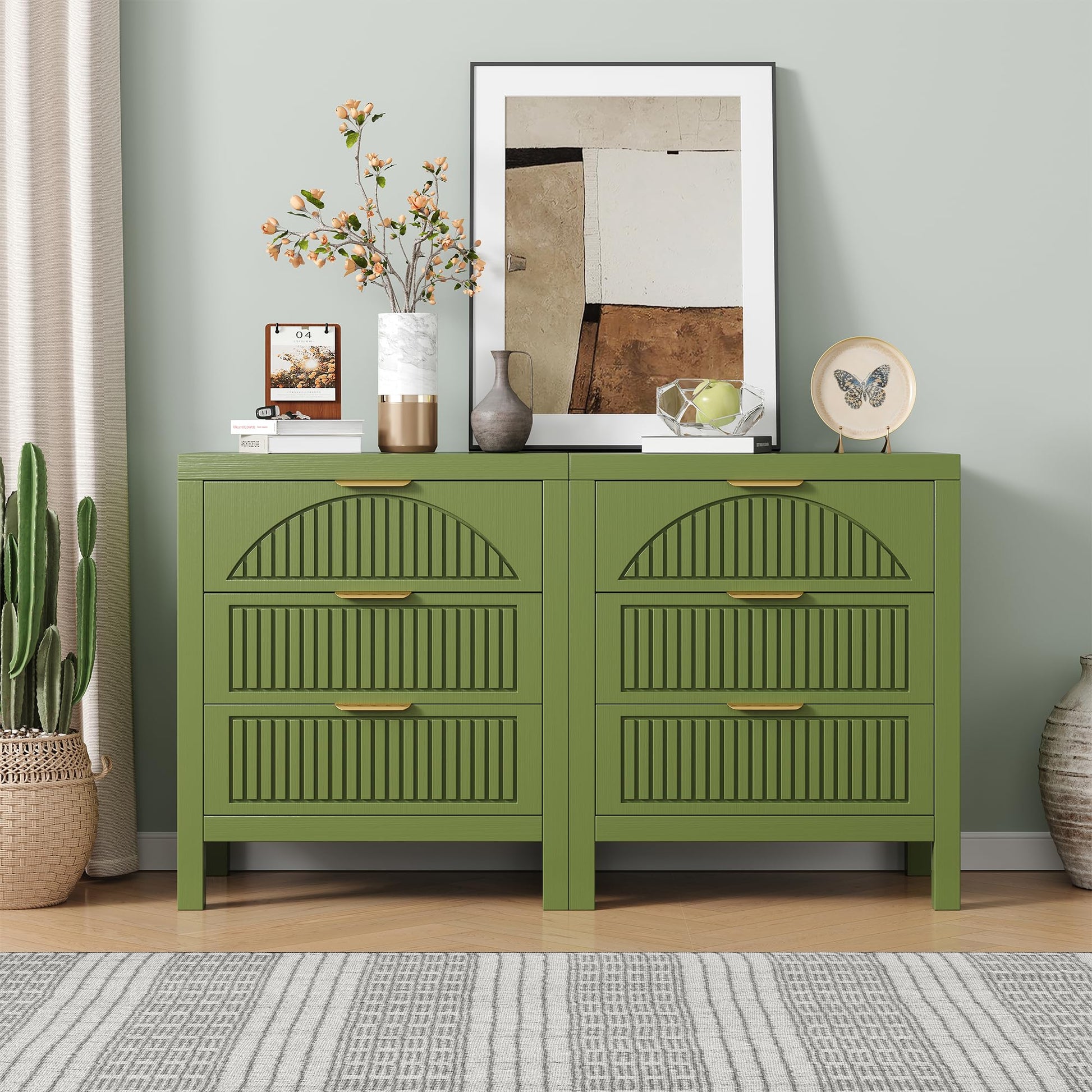 This farmhouse-style dresser combines mid-century modern design with practical storage solutions. The fluted chest features three spacious drawers perfect for organizing clothing, linens, and accessories.