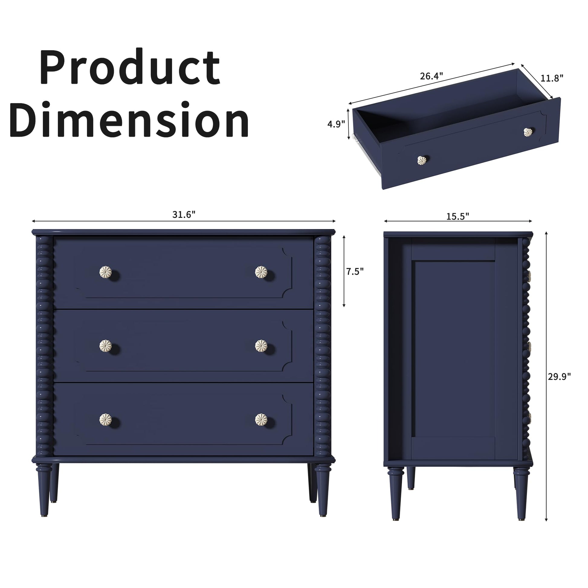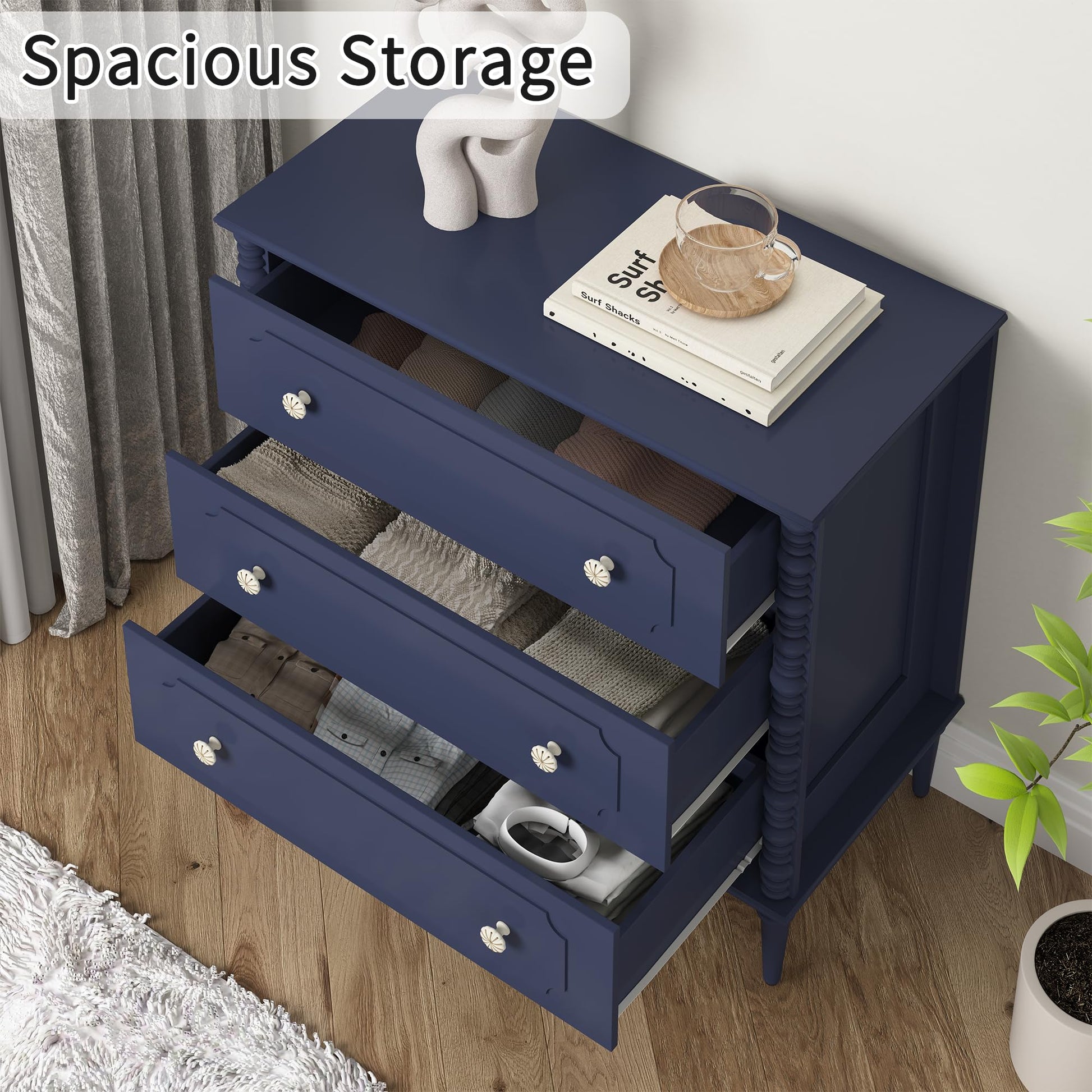 This modern wood chest of drawers features three spacious drawers and elegant turned legs, perfect for bedrooms, dorms, hallways, or entryways. The dresser combines functionality with classic design elements to provide ample storage while enhancing your space.