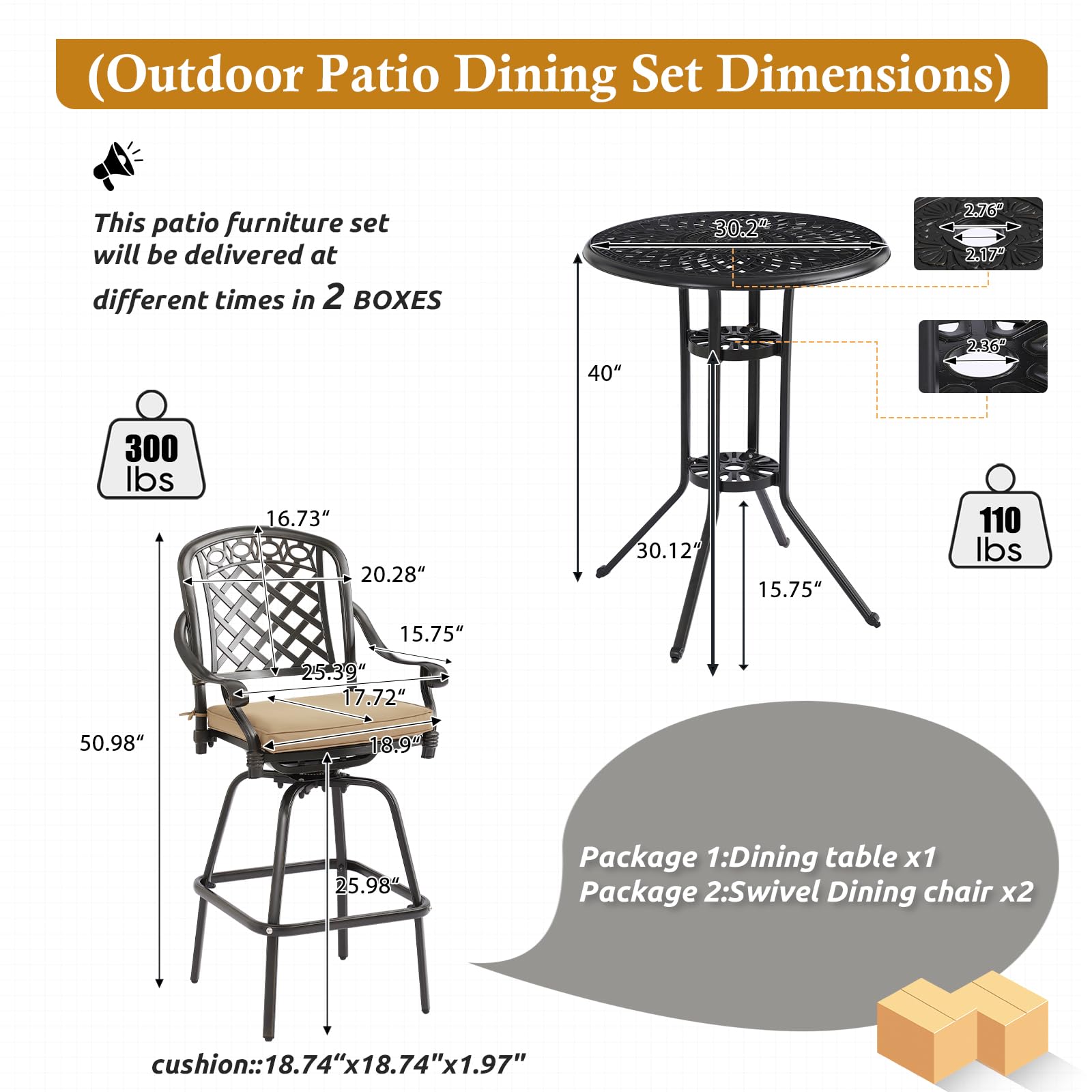 - Quick & Easy Setup: The 3-piece bar height table and chairs ship in 2 packages for easy transport. The patio cast aluminum bar set includes 1 bar table (30.2” D x 40” H) and 2 bar stools (21.26” D x 21.65” W x 50.6” H) with quick setup for patio, lawn & garden