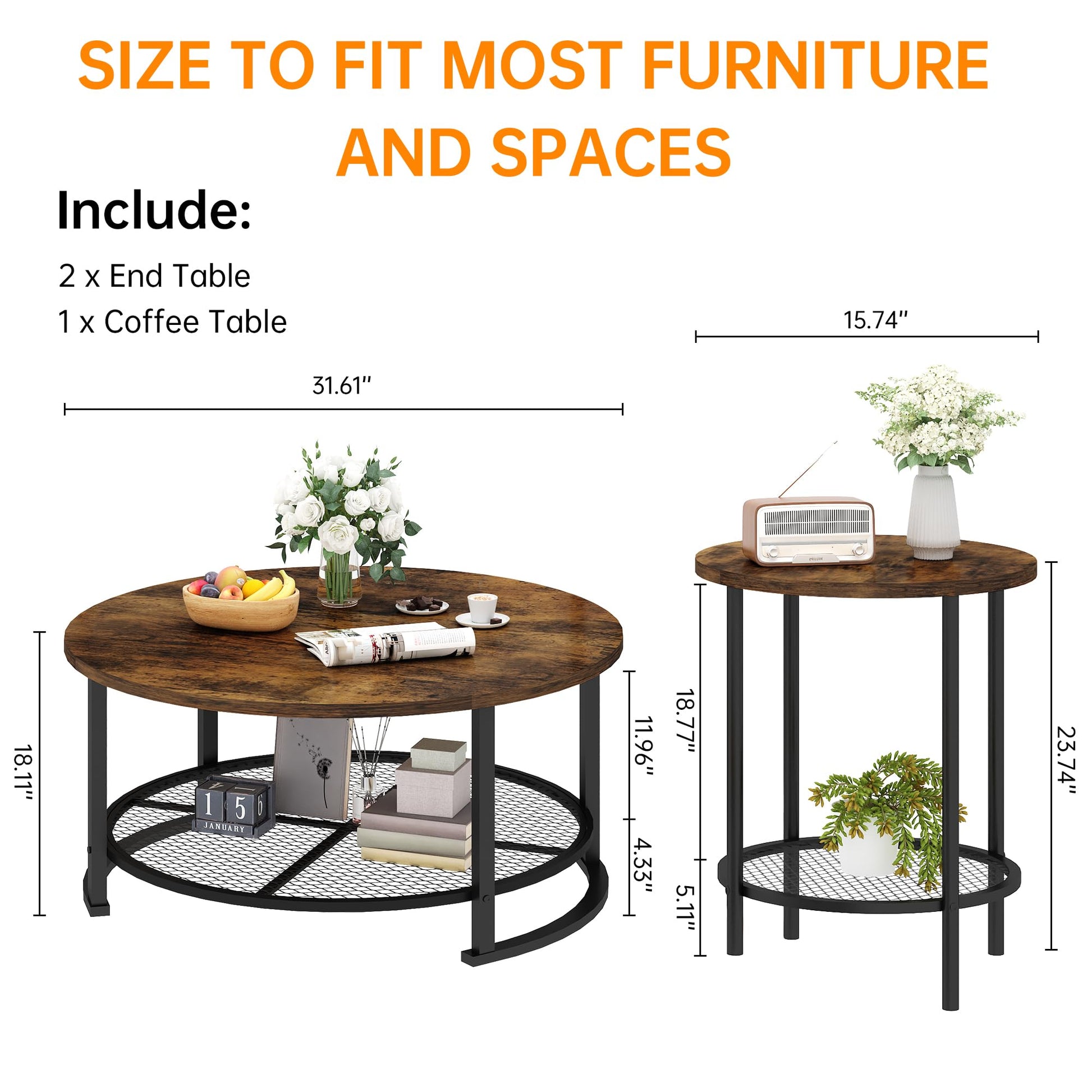 This industrial 3-piece coffee table set combines rustic charm with modern functionality. The set includes one storage coffee table and two end tables, perfect for living rooms, apartments, or bedrooms. Crafted with a sturdy metal frame and textured wooden tabletops, this collection blends durability with farmhouse minimalism.