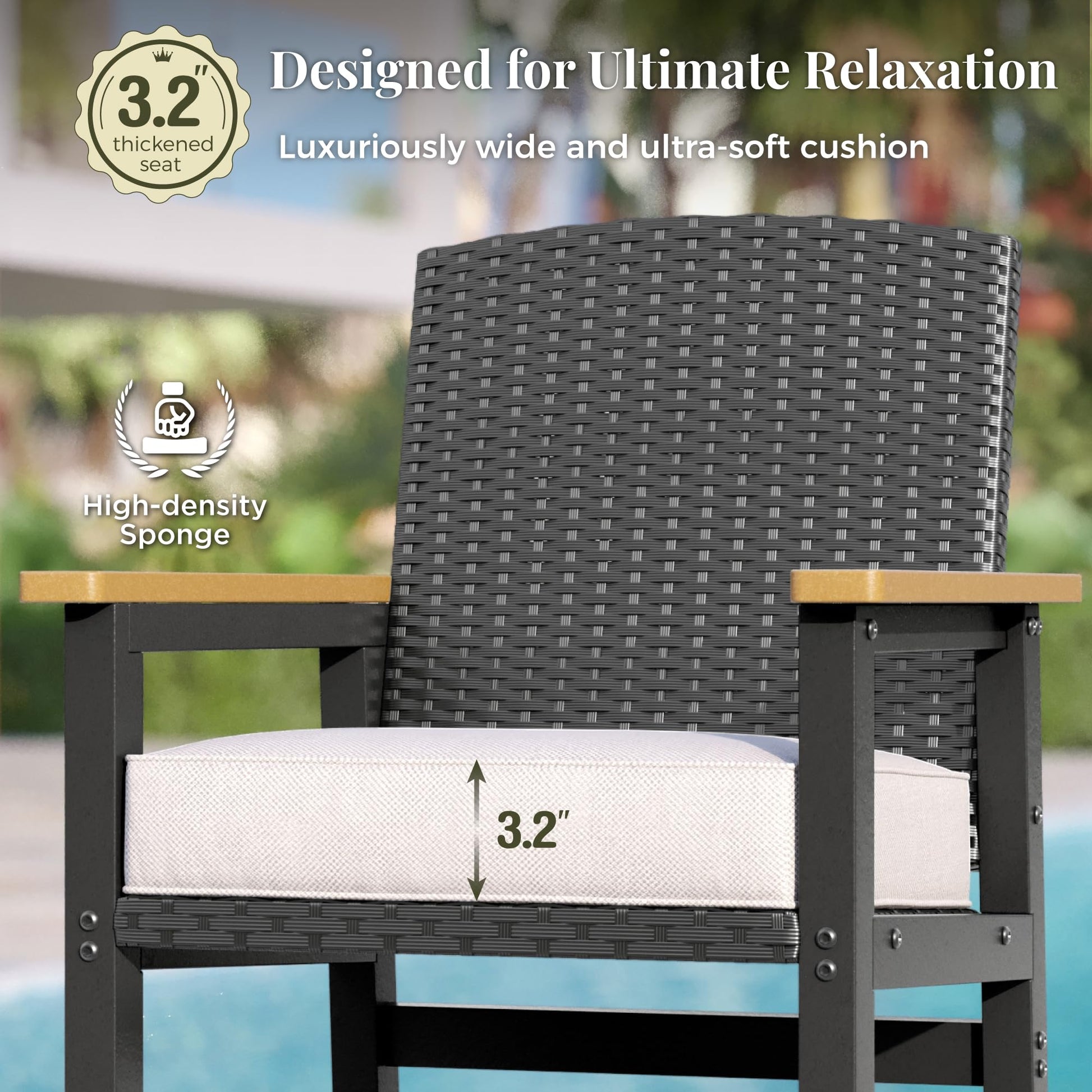Engineered for relaxation, the chairs feature deep 19.7" x 19.7" rattan seats with thick 3" cushions (included) and wide armrests. The breathable woven texture provides superior comfort for extended lounging.