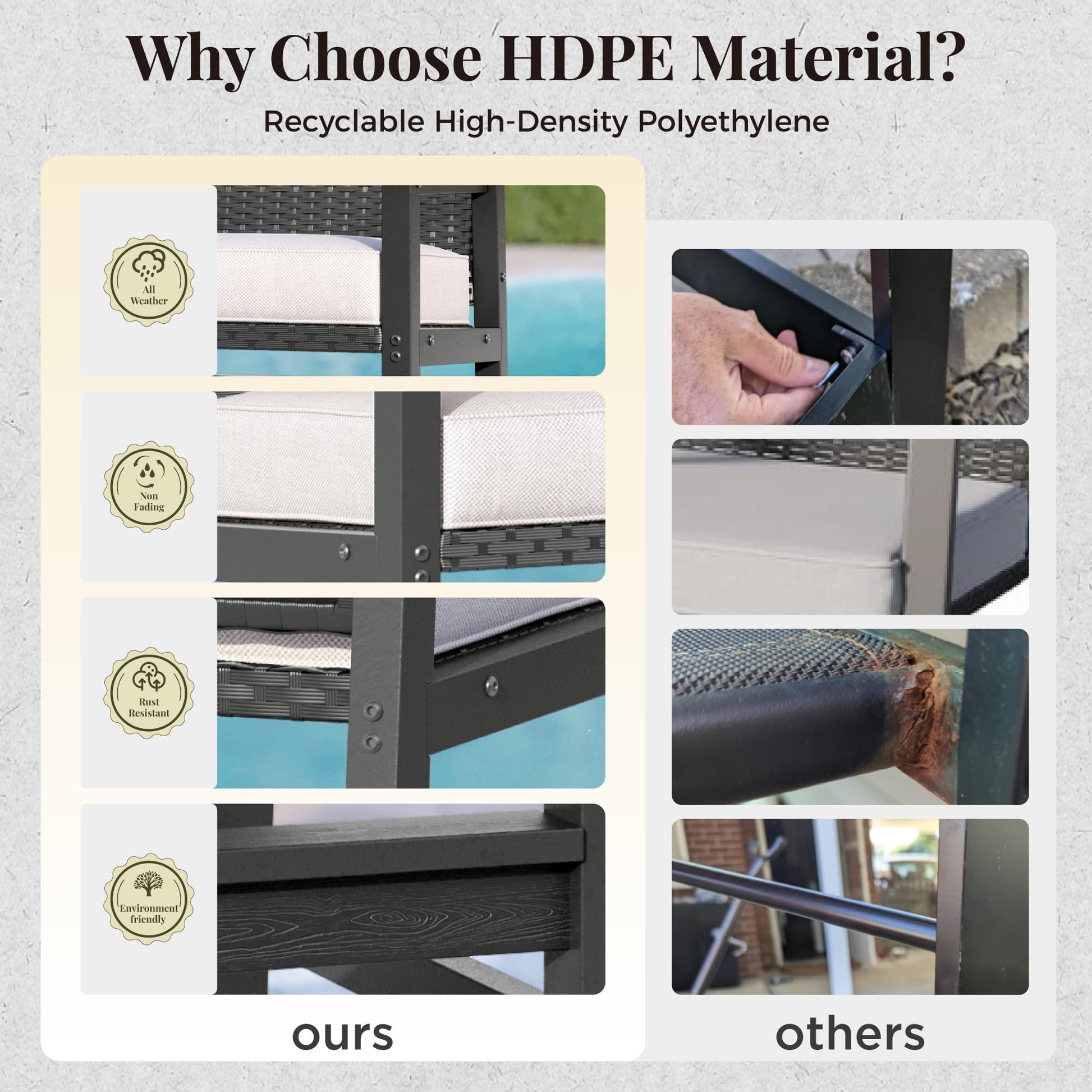 Constructed from 100% waterproof HDPE and weather-resistant rattan, this set withstands rain, sun, and humidity without rusting or warping. The materials ensure years of maintenance-free use in any climate.