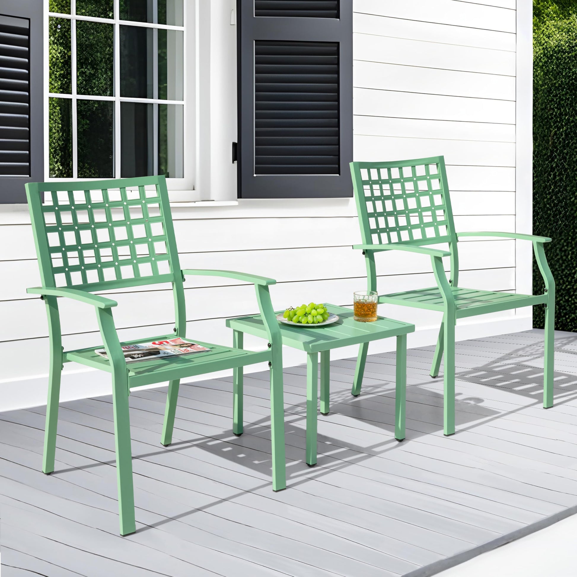 Transform your outdoor space with this all-weather patio bistro set. Featuring a stackable design perfect for small spaces, this 3-piece furniture set includes two metal chairs and a square table ideal for balconies, porches, gardens, and decks.