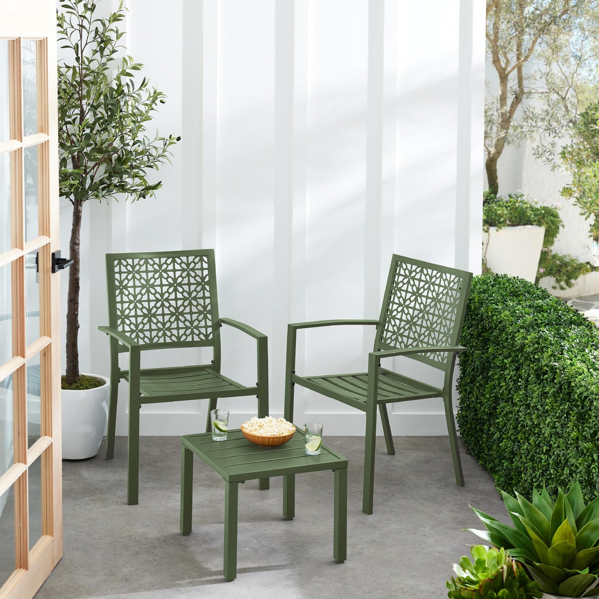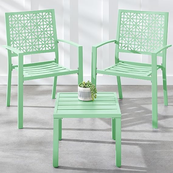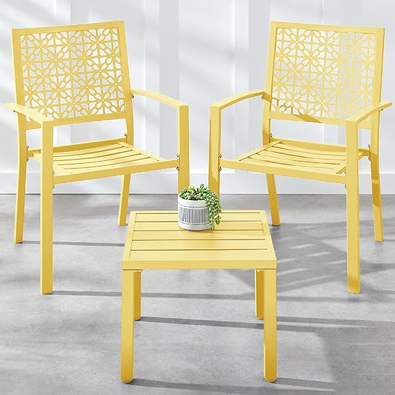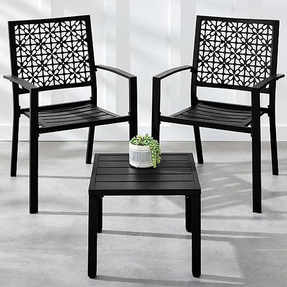Transform your outdoor space with this modern 3-piece bistro set featuring stackable steel chairs and a matching table. The geometric design adds contemporary style to your porch, patio, or garden while the durable steel construction ensures long-lasting performance.