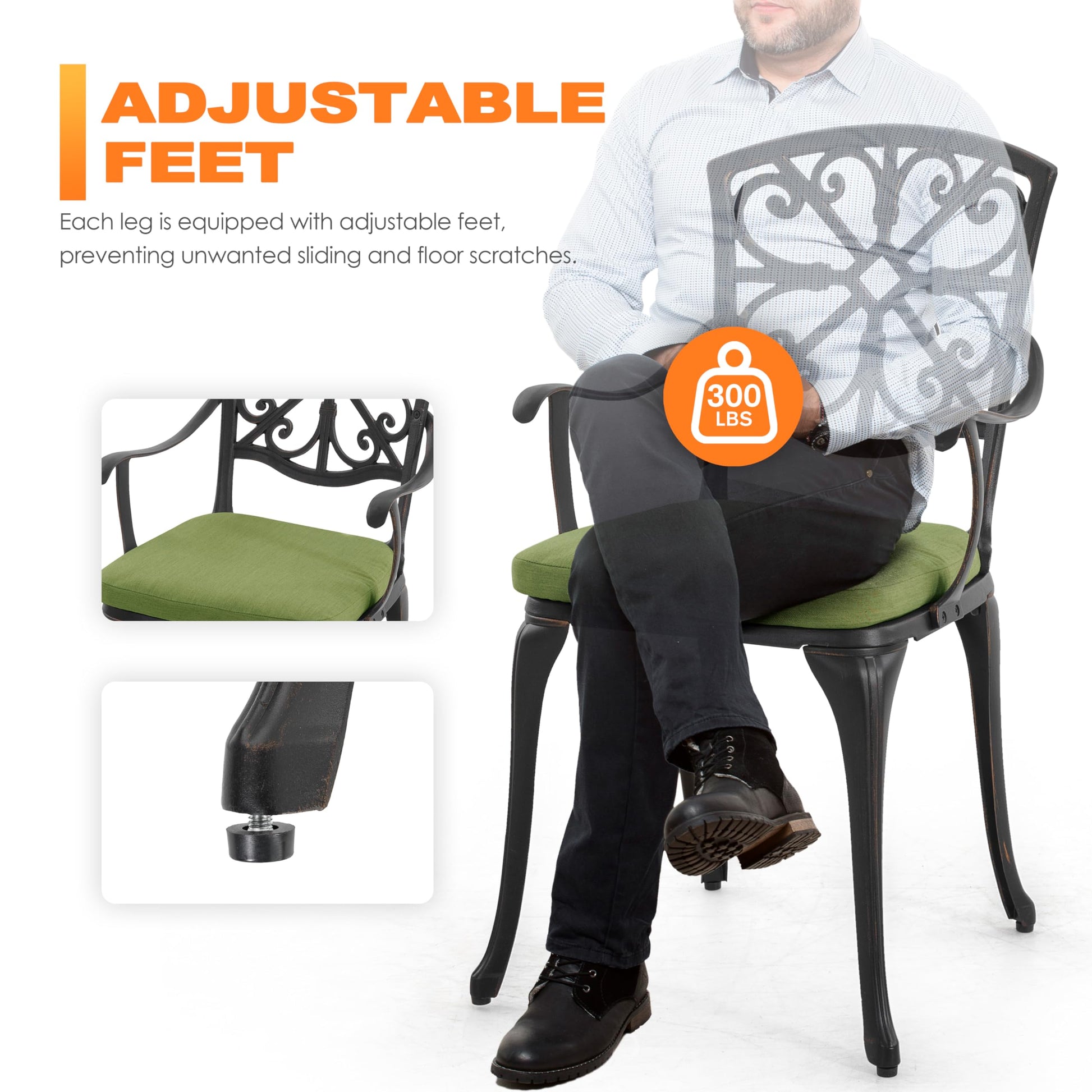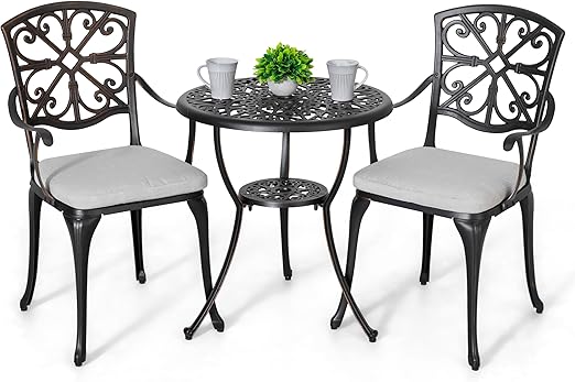 Transform your outdoor space with this elegant 3-piece bistro set, featuring a round cast aluminum table and two matching armchairs with comfortable cushions. The sophisticated black finish with gold-painted edge adds a touch of luxury to any patio, balcony, or garden setting.
