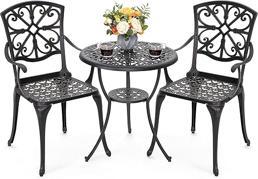 This bistro set combines functionality with style, making it an ideal choice for small outdoor spaces, balconies, or as an accent piece in larger patios. The cast aluminum construction ensures durability while remaining lightweight and easy to move.