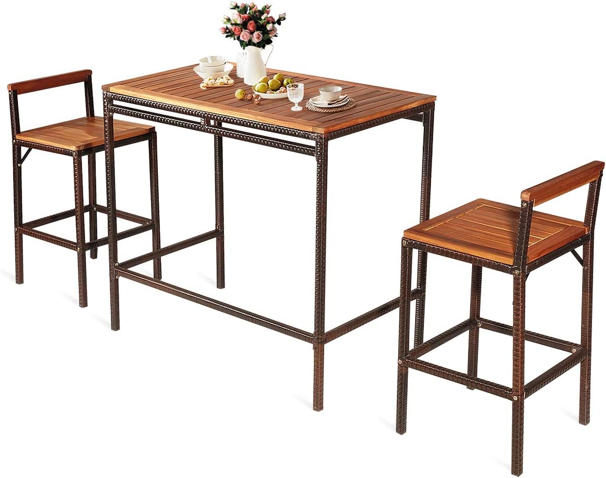 3-Piece Outdoor Rattan Bar Set with Acacia Wood