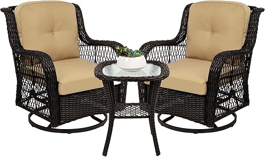 Transform your outdoor space with this elegant 3-piece wicker patio bistro set, featuring two 360-degree swivel rocking chairs and a matching tempered glass side table. Perfect for relaxing on your patio, deck, or garden while enjoying the comfort of weather-resistant cushions and durable wicker construction.
