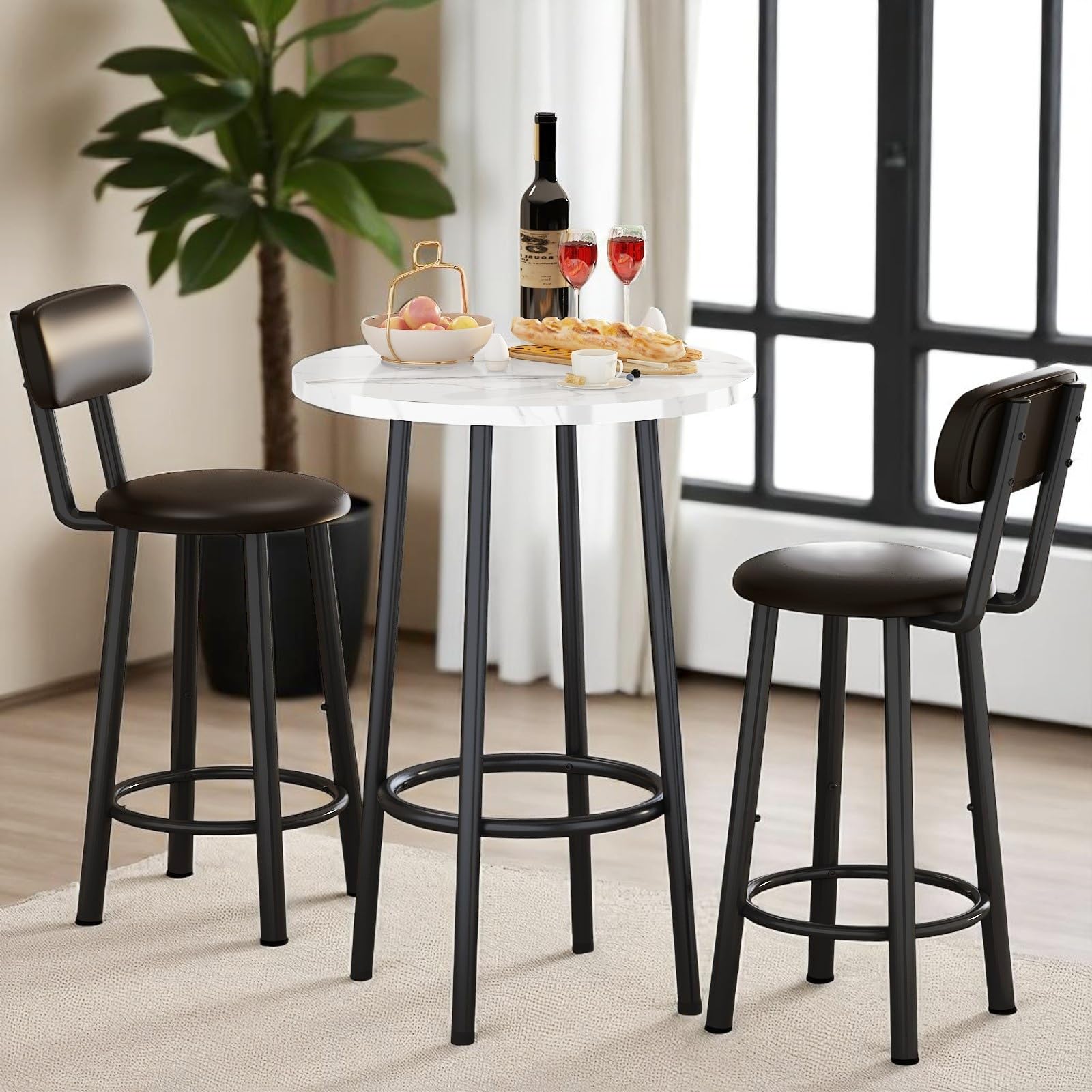 This compact 3-piece dining set is designed for small spaces, featuring a round table and two upholstered stools that tuck neatly underneath when not in use. The modern design combines functionality with comfort, making it perfect for apartments, kitchens, dining rooms, or living areas.