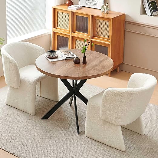 The round dining table features a durable engineered wood desktop that provides a stable and spacious surface for meals, work, or entertaining. The circular design promotes conversation and maximizes space efficiency, making it ideal for apartments, breakfast nooks, or compact dining areas.
