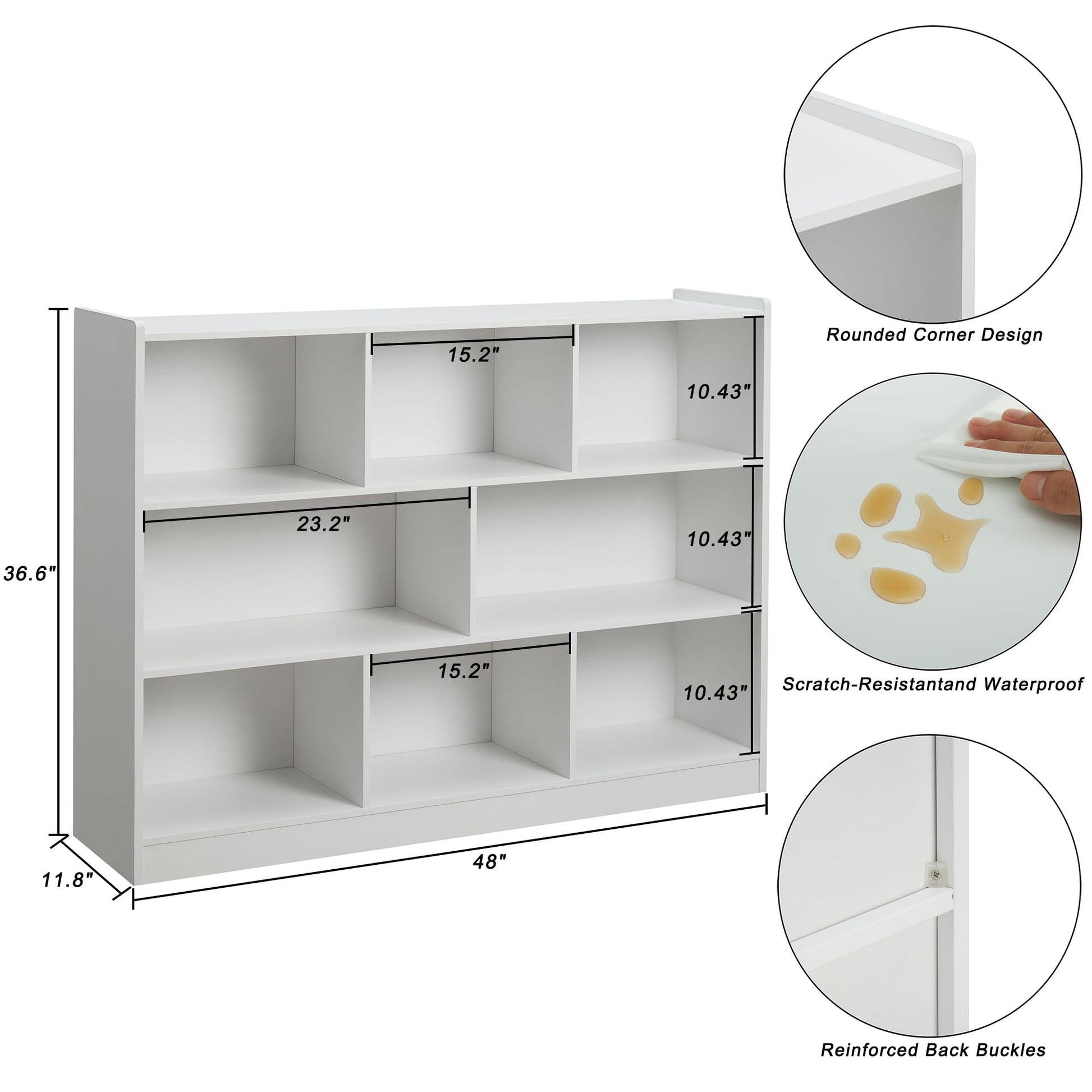 - 【Simple and Practical】- This well-designed 3-tier storage display cabinet measuring 48” x 11.8” x 36.6”. The spacious top provides ample room for displaying photo frames, plants, or any decorative items you choose. With its sleek white lacquer surface, the cabinet is not only easy to clean but also waterproof and wear-resistant. The reinforced back buckles and anti-slip pads add extra stability and safety, making it the perfect any home.