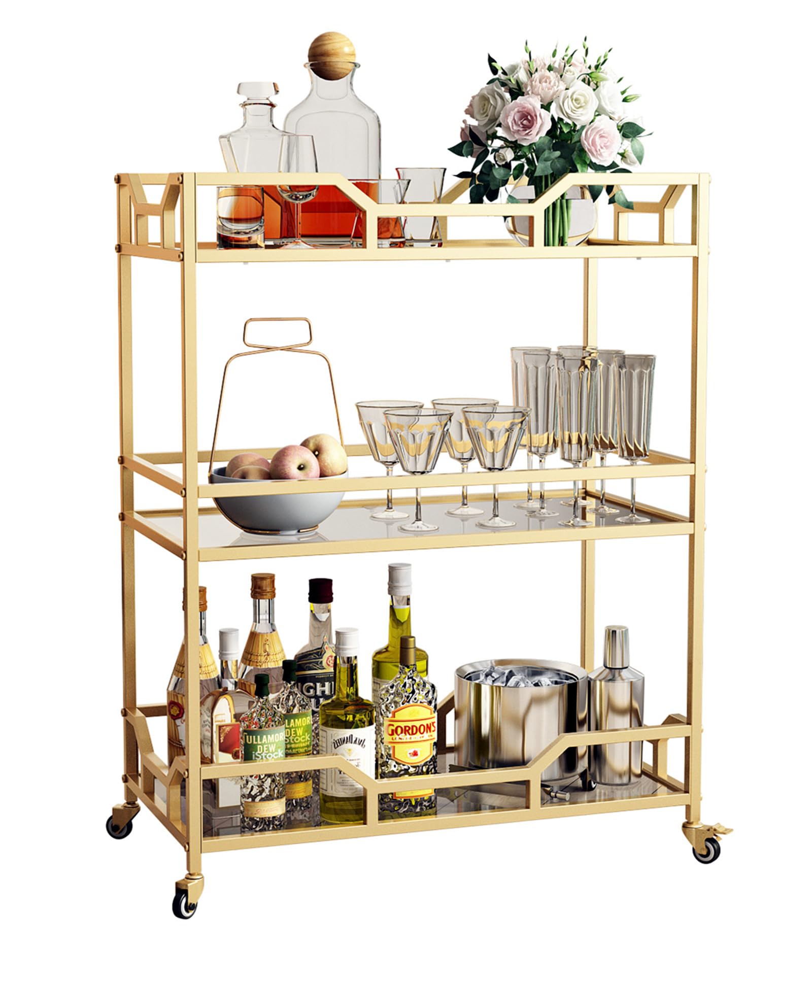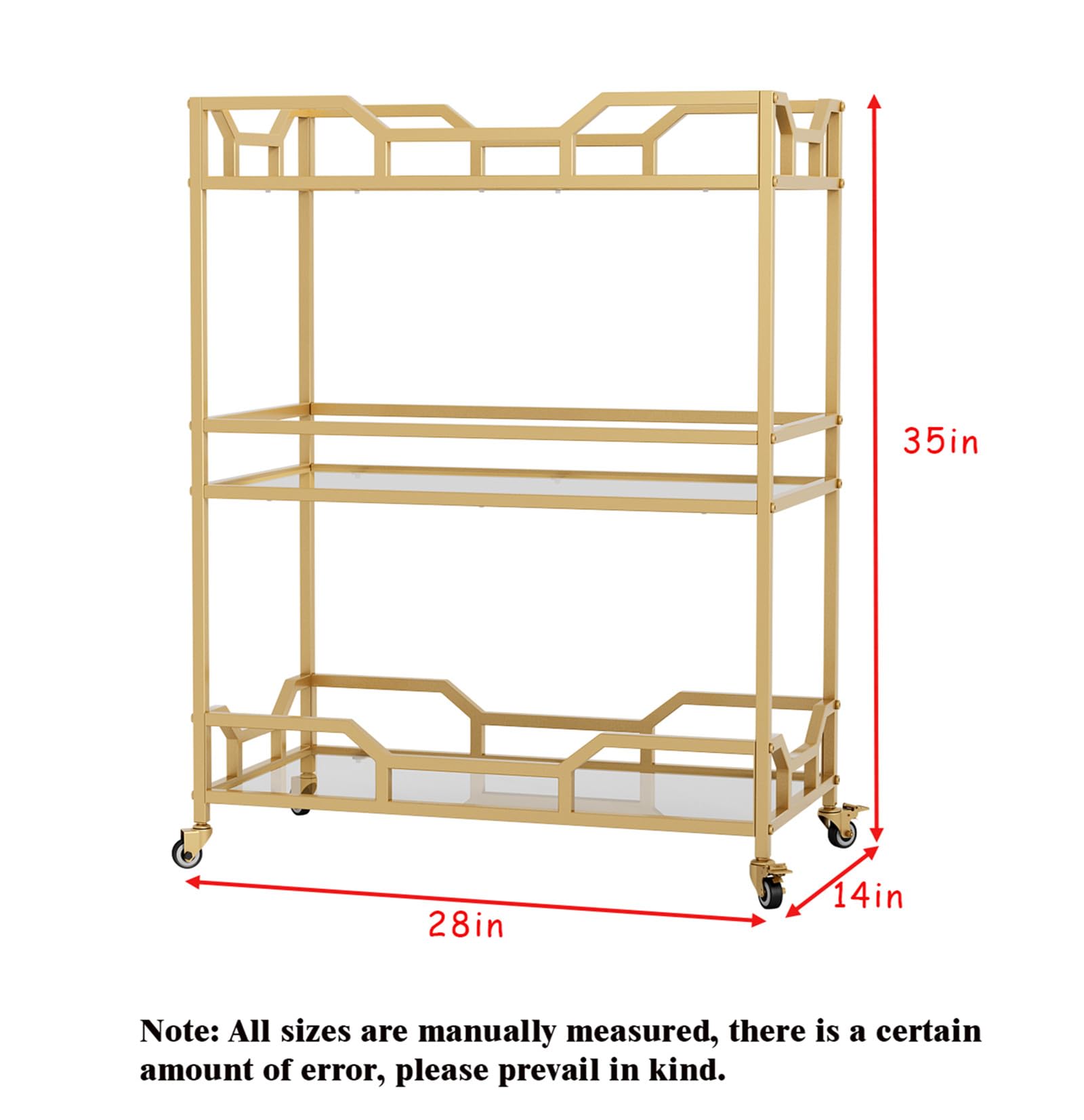 Elevate your entertaining space with this elegant 3-tier bar cart featuring a sophisticated gold finish and tempered glass shelves. Designed for both functionality and style, this mobile serving station brings convenience and glamour to your kitchen, dining room, or home bar.