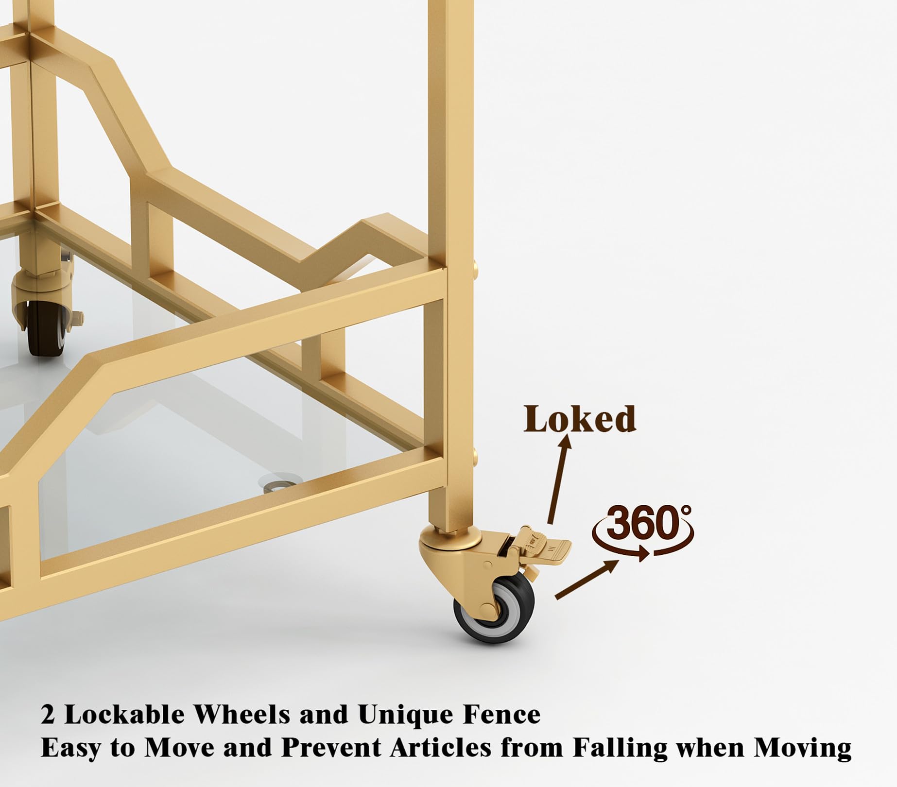 3-Tier Gold Bar Cart with Glass Shelves on Wheels