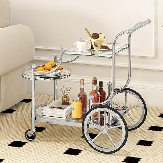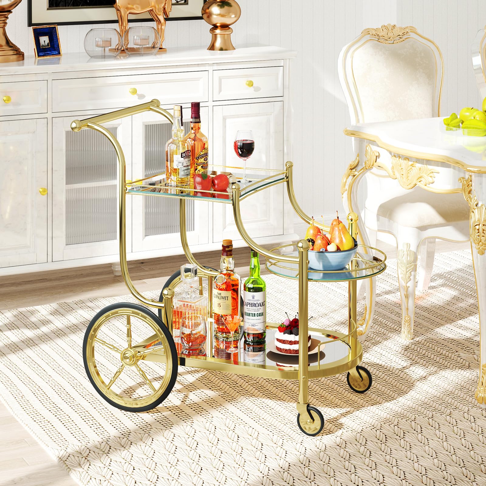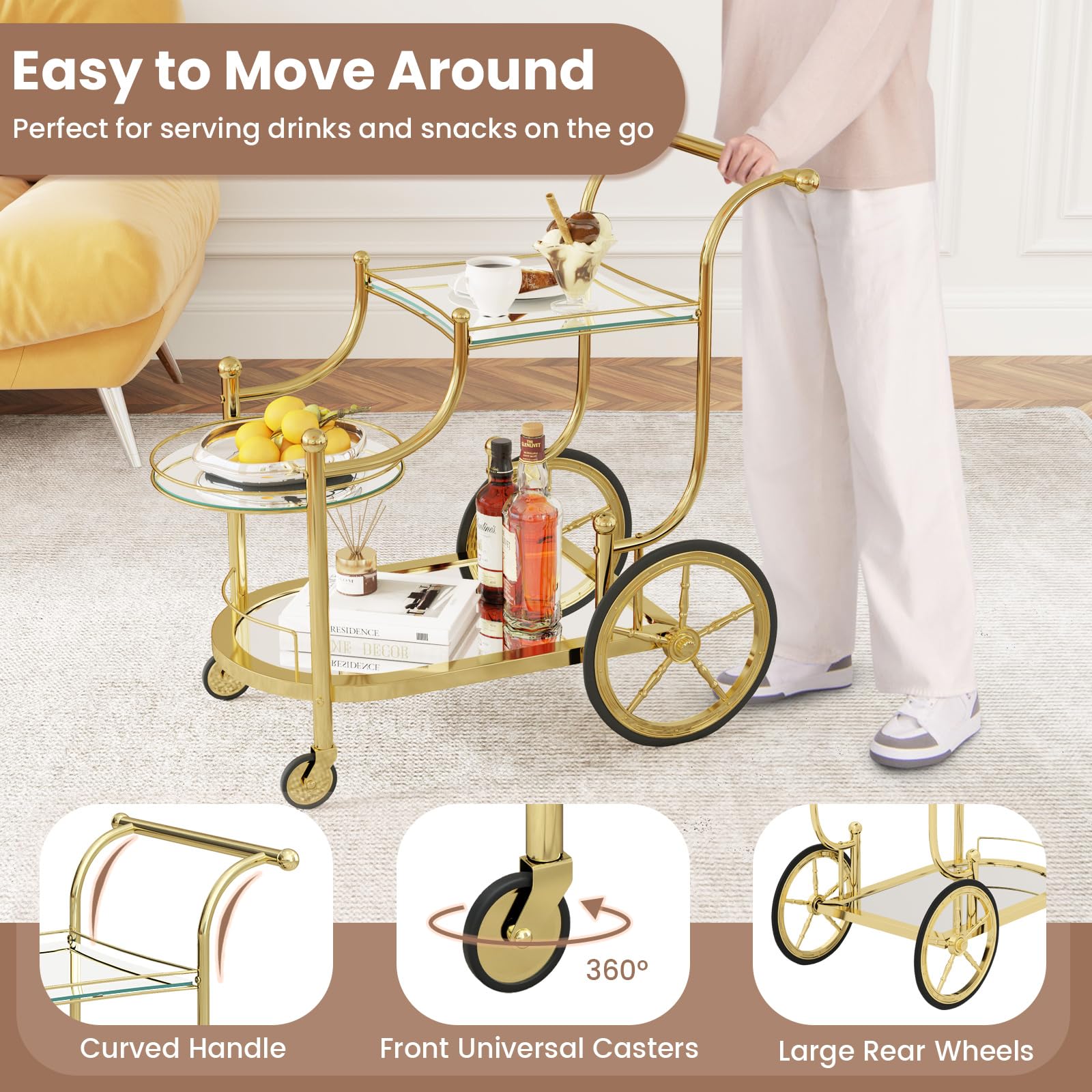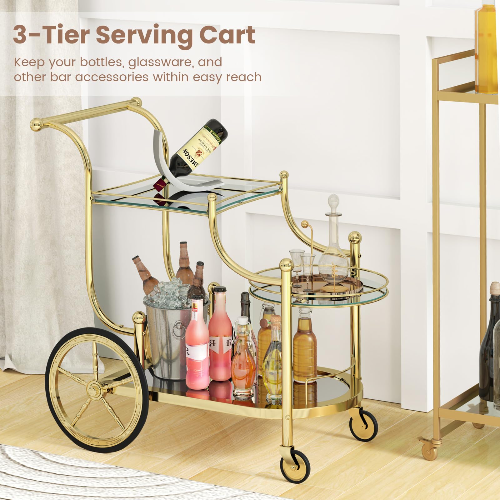 Elevate your entertaining space with this elegant 3-tier rolling bar cart featuring mirrored shelves and a sophisticated gold finish. Perfect for serving drinks, displaying beverages, or organizing bar essentials in your home, dining room, living room, hotel, or club.