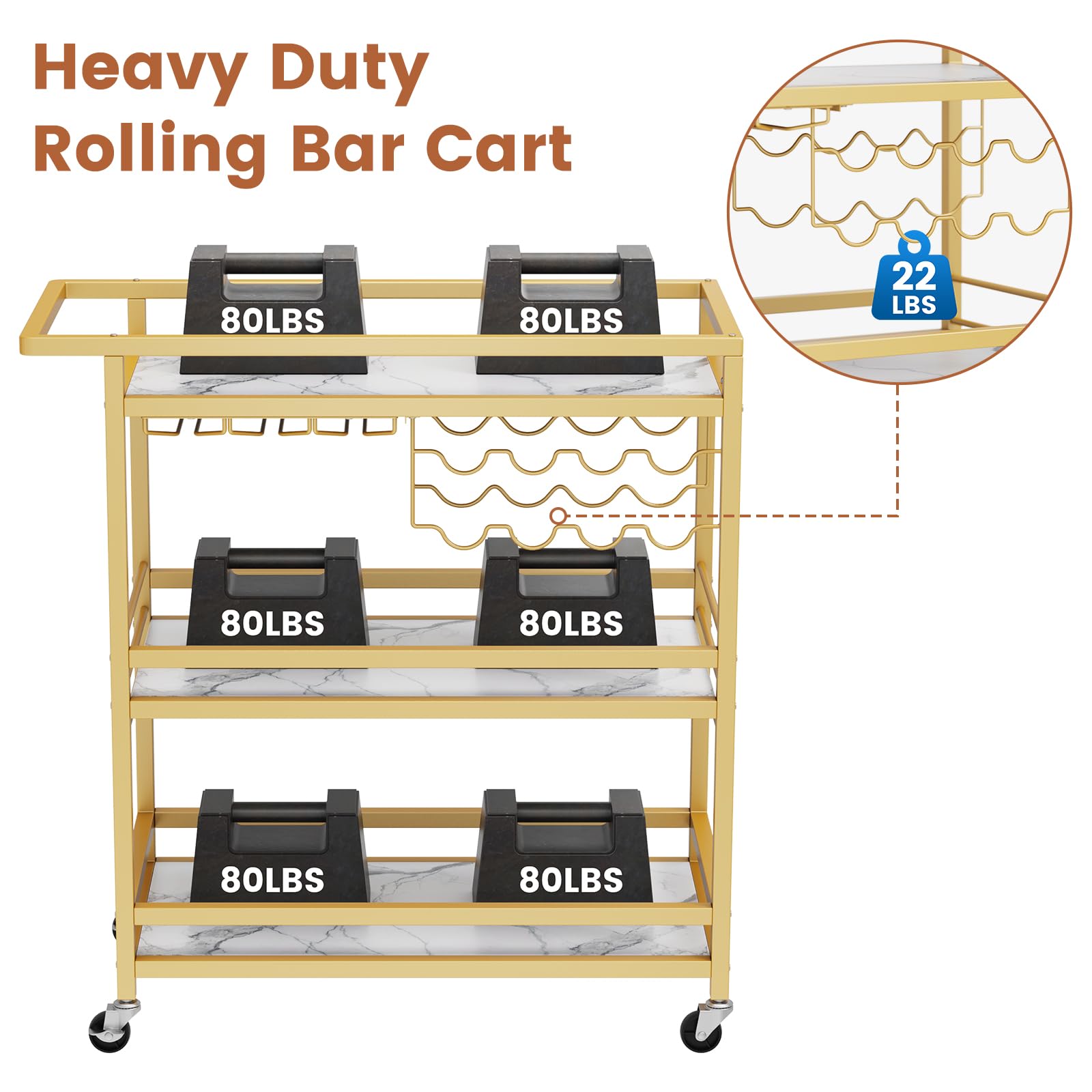 This elegant 3-tier serving cart combines functionality with sophisticated design, perfect for entertaining and everyday use. The gold-finished frame paired with marbled wooden shelves creates a stunning visual appeal that complements any décor style.