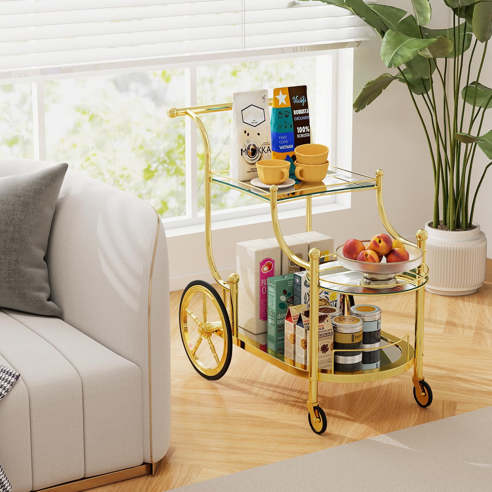 This elegant 3-tier rolling bar cart combines functionality with sophisticated design, perfect for entertaining and serving beverages in style. Featuring mirrored shelves that add a touch of glamour and reflect light beautifully, this mobile cart brings both practicality and visual appeal to any space.