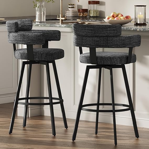Elevate your kitchen island or dining area with this sophisticated set of 2 swivel bar stools. Featuring a full back design with linen padded cushioning, these modern bar height stools combine comfort with contemporary style. The 360-degree swivel mechanism and sturdy metal footrest provide exceptional functionality for everyday use.