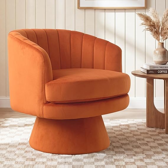 This swivel barrel chair combines comfort, style, and functionality. The beige color coordinates beautifully with curtains, rugs, bedding, pillows, and wallpaper, making it a versatile piece for any room in your home.