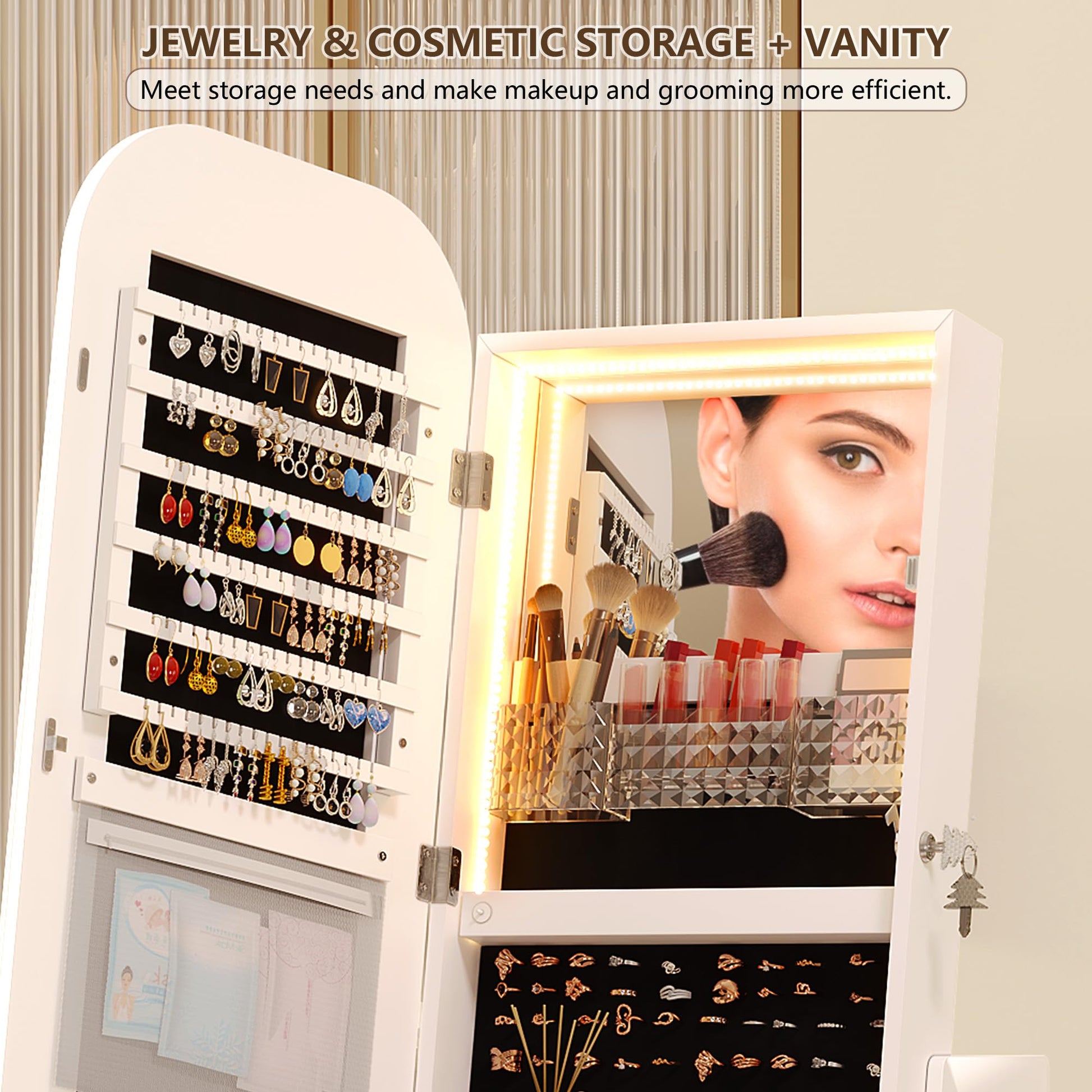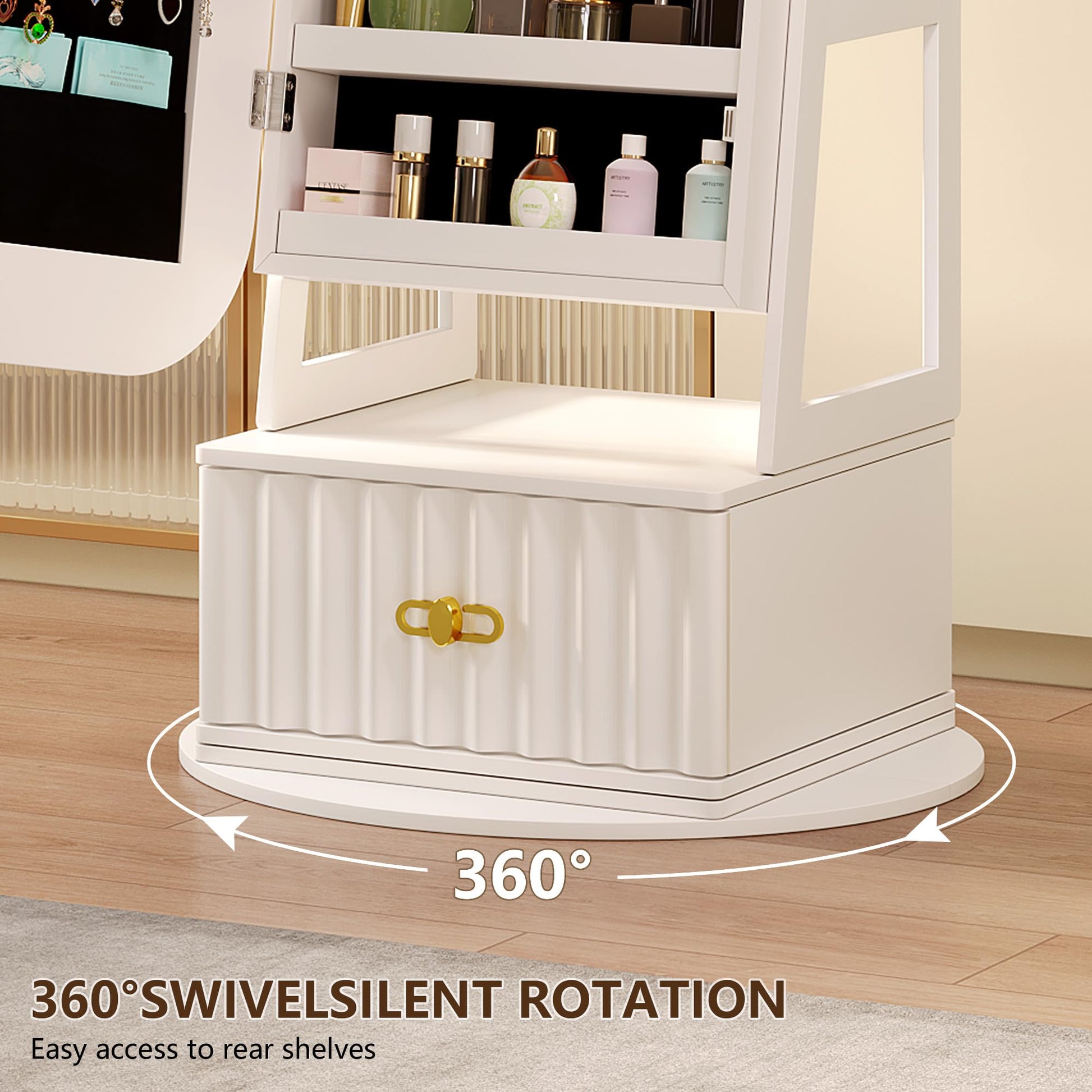 Transform your bedroom or dressing area with this elegant full-length mirror jewelry cabinet that combines functionality with sophisticated design. The 360° swivel feature allows you to view yourself from every angle, while the built-in LED lights provide perfect illumination for getting ready.