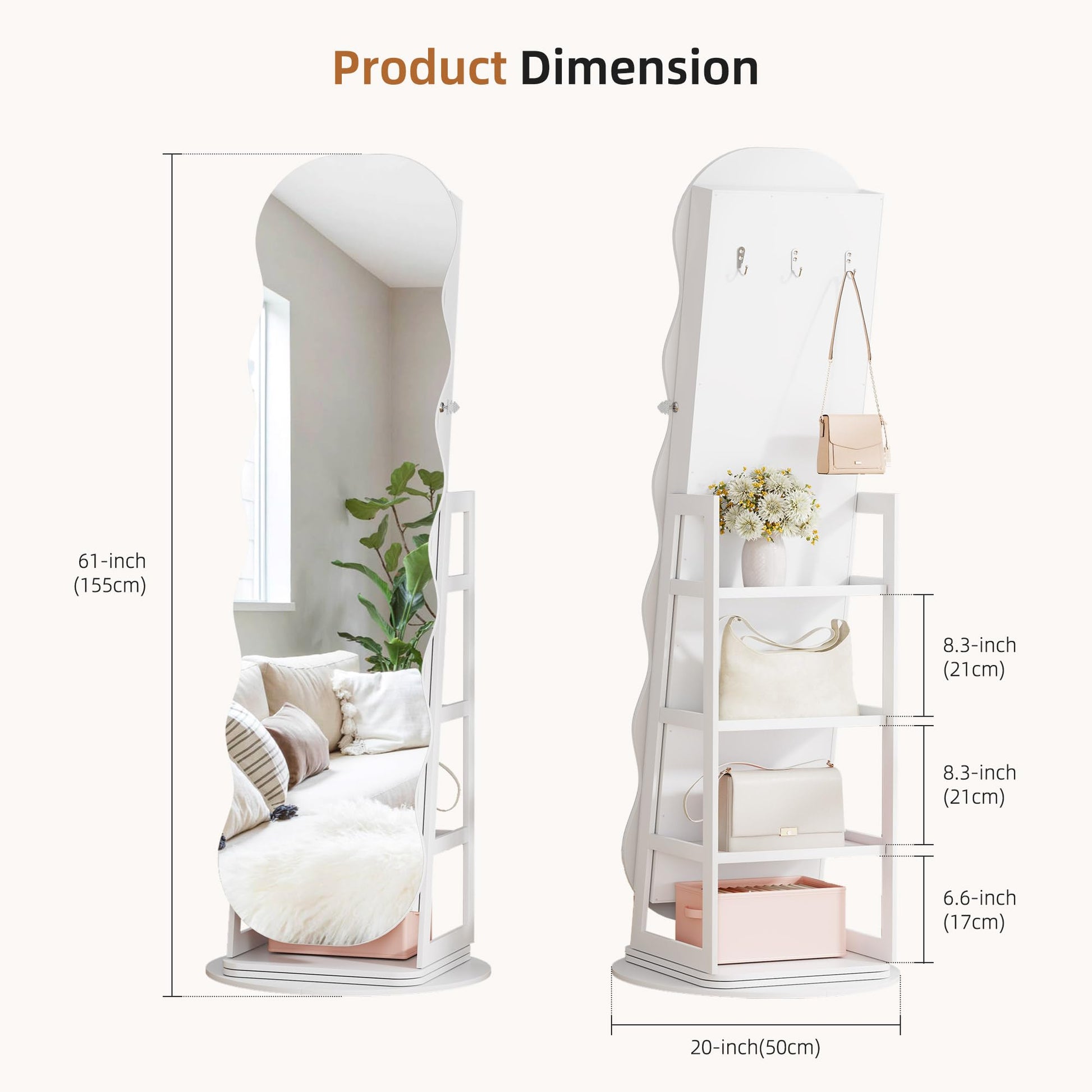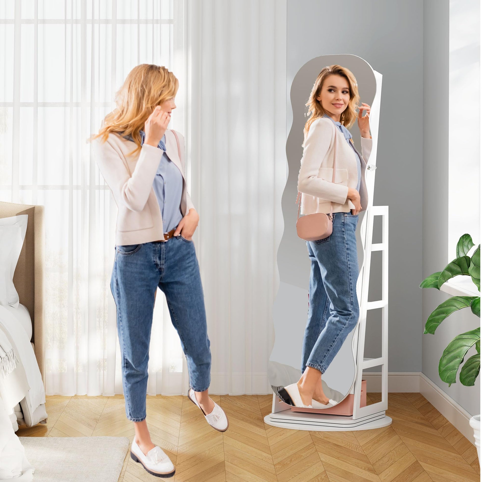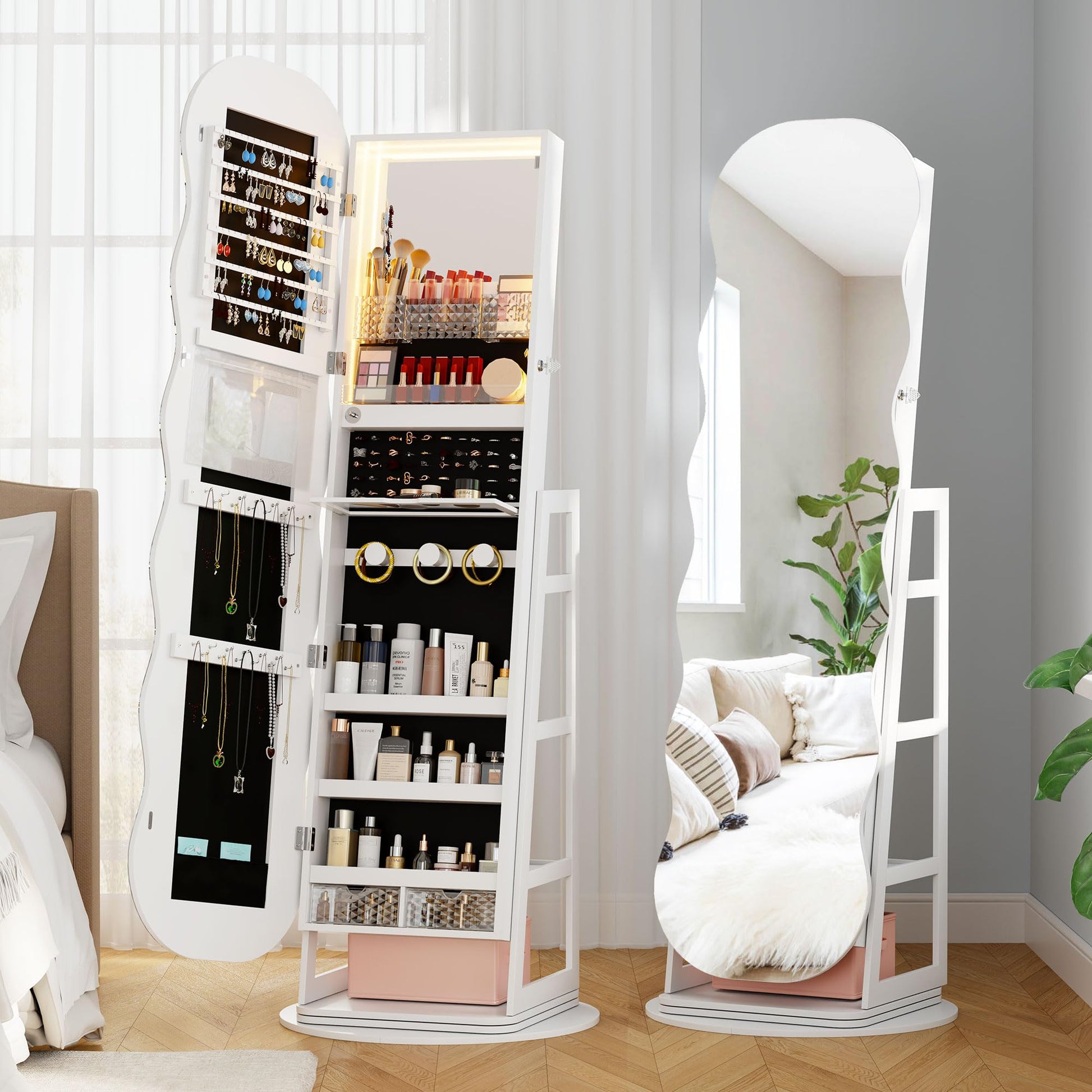 Transform your jewelry storage with this elegant rotating jewelry cabinet featuring integrated LED lighting and a full-length wavy mirror. The lockable design provides secure storage while the 360° swivel base offers convenient access from any angle.