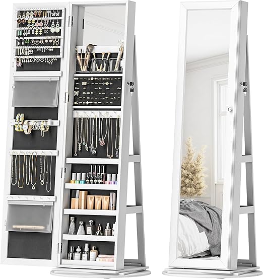 This elegant jewelry armoire combines functionality with style, featuring a full-length mirror and 360° swivel base for easy access from any angle. The lockable design keeps your valuables secure while providing organized storage for all your jewelry and accessories.