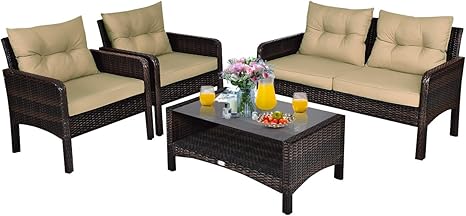 This versatile outdoor furniture set combines comfort and functionality for your patio, porch, garden, or poolside. The 4-piece configuration includes two single sofas, one loveseat, and a tempered glass coffee table, comfortably seating 4-5 people.