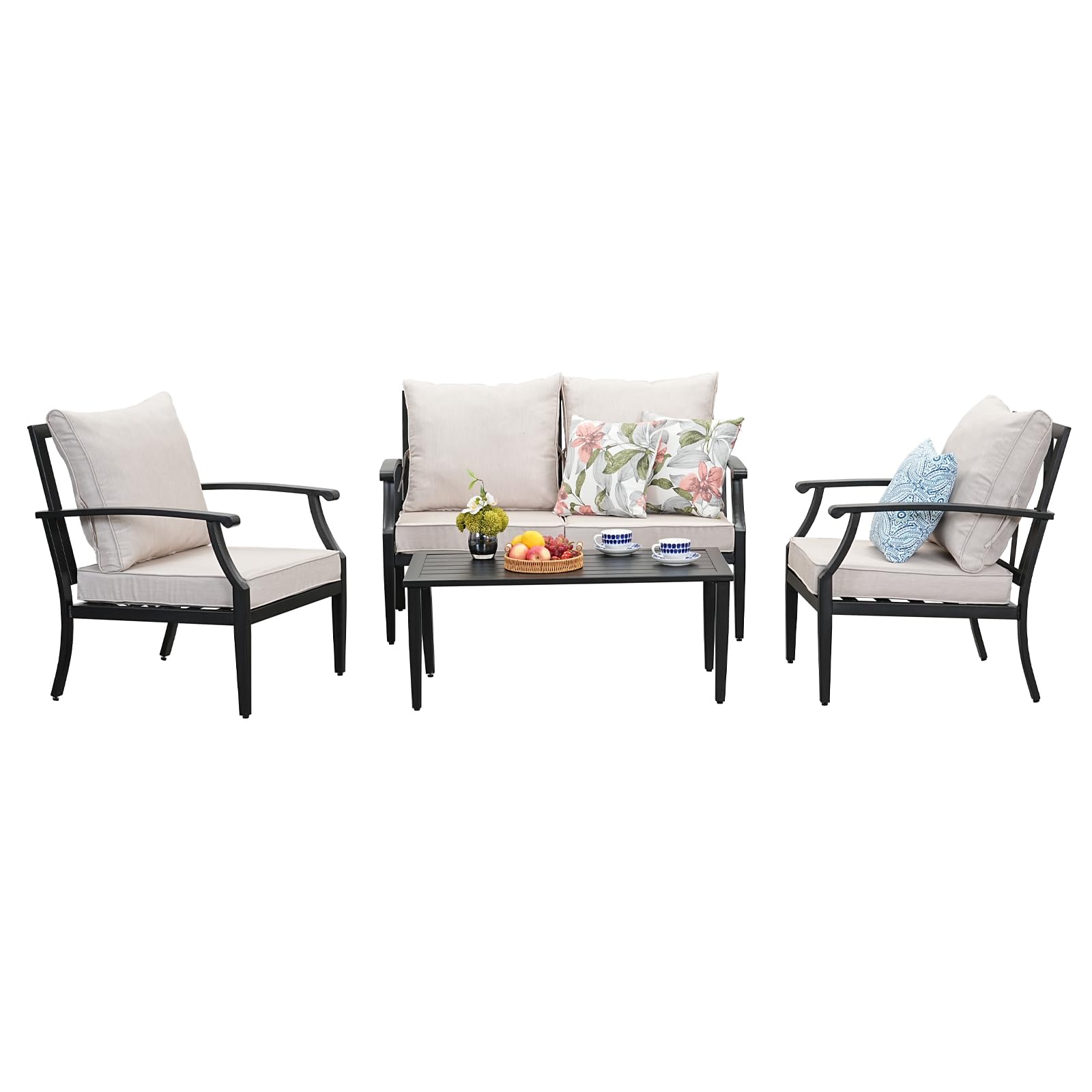 Transform your outdoor space with this complete 4-piece patio furniture set designed for comfort and durability. This all-weather metal conversation set features a wider seating sofa with high back support, a matching loveseat, and a functional coffee table, perfect for creating an inviting outdoor living area.