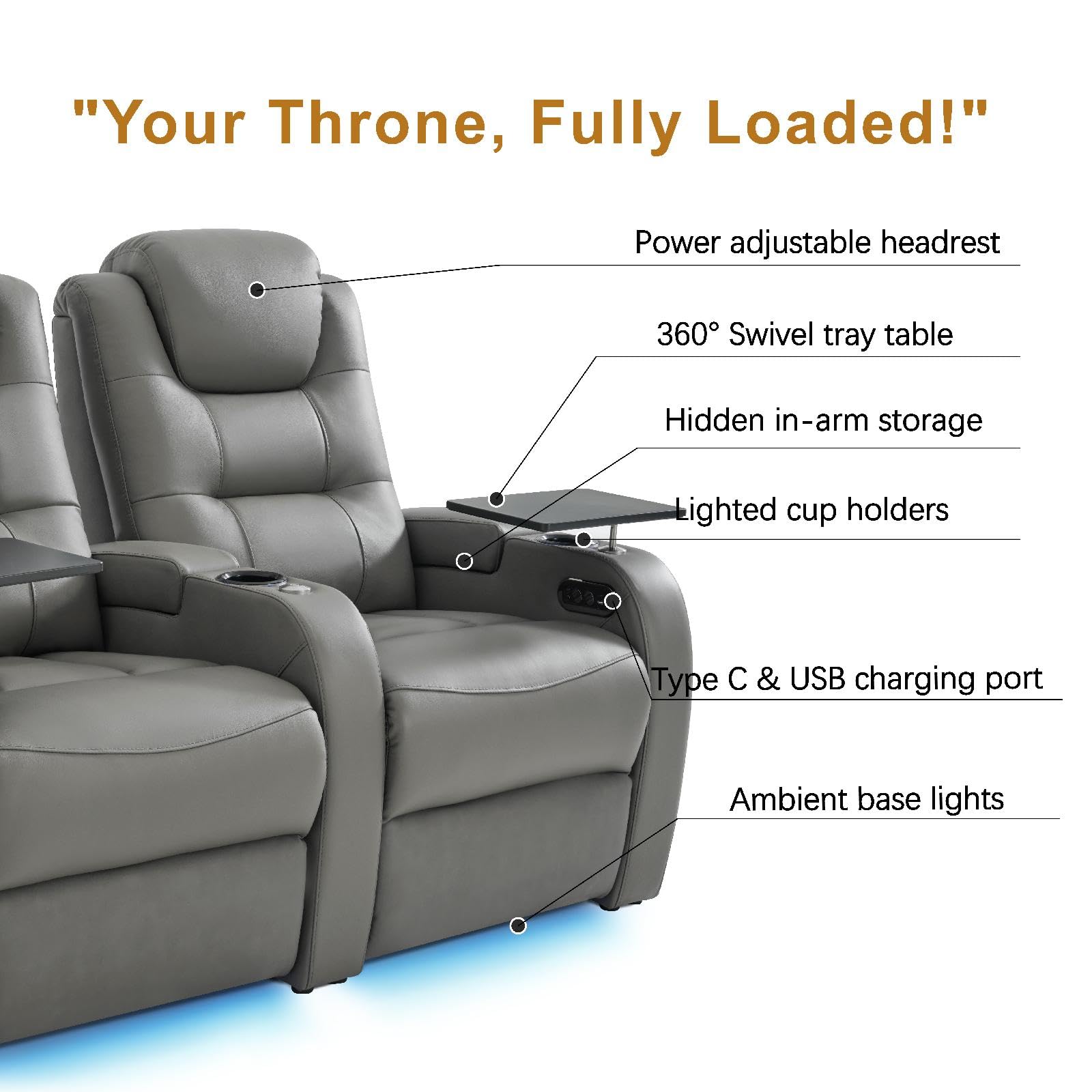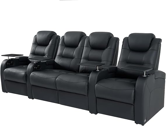 Experience premium comfort with this luxury home theater seating designed for ultimate relaxation. This 4-seat sectional recliner features dual power electric headrests, high-density memory foam cushioning, and genuine leather upholstery in sophisticated grey.