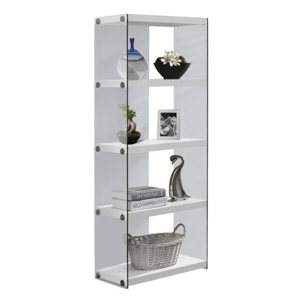 This contemporary 4-shelf bookcase combines sleek design with functional storage. Featuring tempered glass shelves and a glossy white finish, it adds modern elegance to any room while providing ample display space for books, decor, and collectibles.